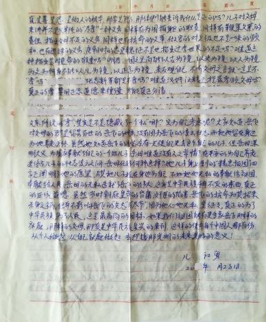 “儿子对父母来讲并不是只(有)单纯的尽孝一种义务,同样有为国捐躯的职责,同样有指出父母不足的义务,同样也有抗命的义举,做官的对上级也不是一味的顺和,也有進谏的义务,唐朝的忠臣魏征不是也指出过李世民的不足吗?一国之主尚能以古为镜,以史为镜,以人为镜,为父为何就不能以儿为镜,以正念为镜,来反观自己,不听父母之言就一定是不‘孝’吗?真正的‘孝’用正念道德来衡量,才能真正分清。父亲所说的‘孝’,是不是隐藏了一个‘私’哪?只为自己考虑呢?岳飞对父母的‘孝’是流芳百世的,岳飞的母亲没有因为岳飞的凌云壮志而把他留在身边,为她养老送终,虽然她知道岳飞的壮志会有一天使自己失去这个儿子,但岳母深明大义,为国家奉献了自己的一个好儿子,她(在)儿子身上刺的‘精忠报国’四字阐明了她的愿望,岳母的无私造就了岳飞的伟大,这就是中华民族千年不灭的东西,真正的正统道德。虽然当时朝廷皇帝的昏庸,奸臣的陷害,岳飞的抗命为其招来杀身之祸,但并不影响岳飞的‘矢志’与‘尽节’,因为他心底无私,堂堂正正,真正的为了中华民族为了人民,这是最高尚的目标。如果我们祖国能有更多像岳飞那样的家庭,那样的父母,那中华民族的复兴就能来到。这样的使命每个中国人都有份,从个人做起,从自己家庭做起,去迎接那光明美好的未来!”