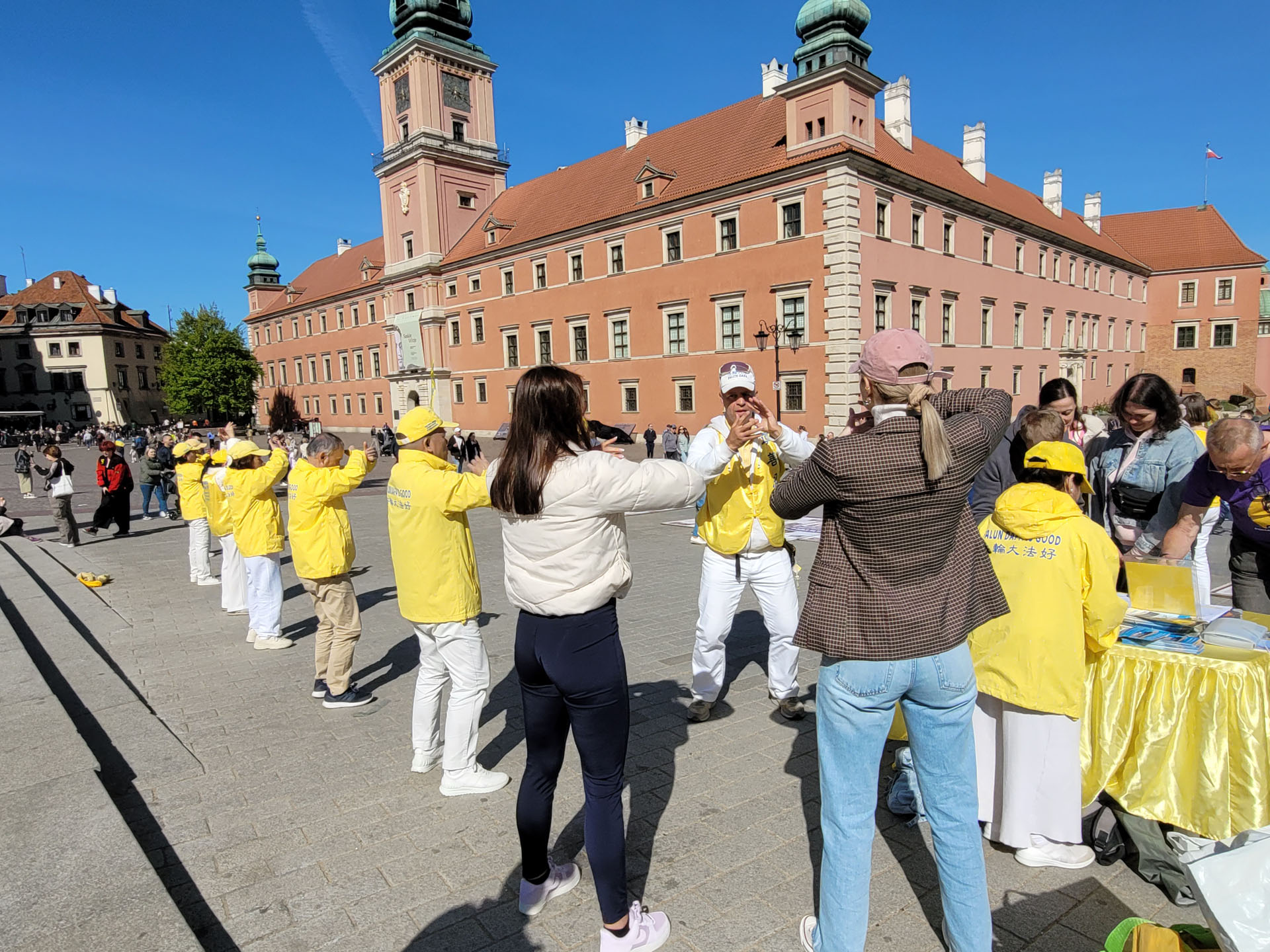 ![]() 图1~5:波兰法轮功学员在华沙古城演示法轮功的五套功法。游人观看法轮功的功法展示,跟着学炼法轮功。 |