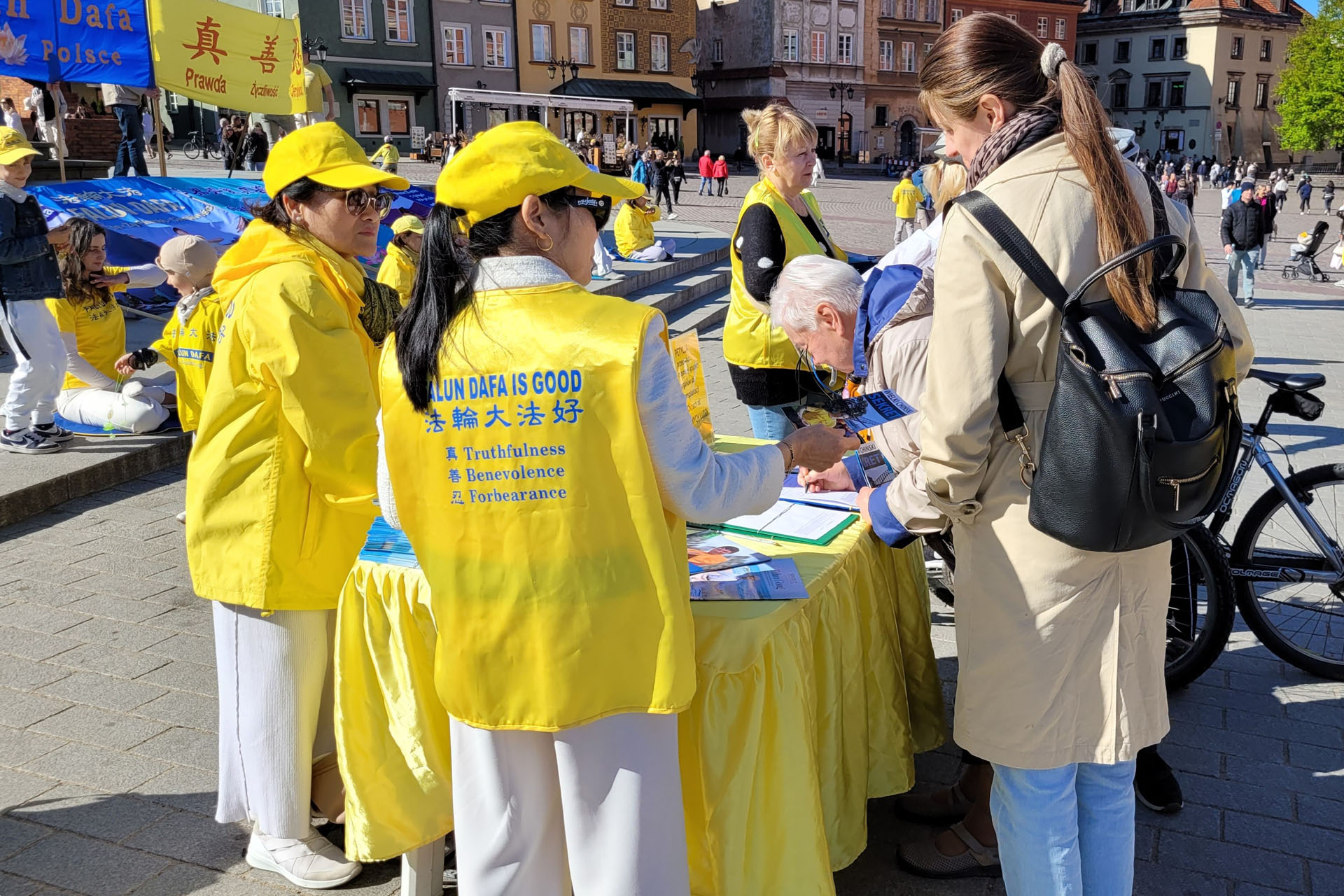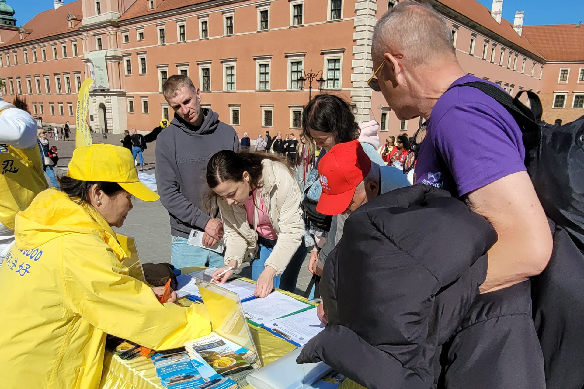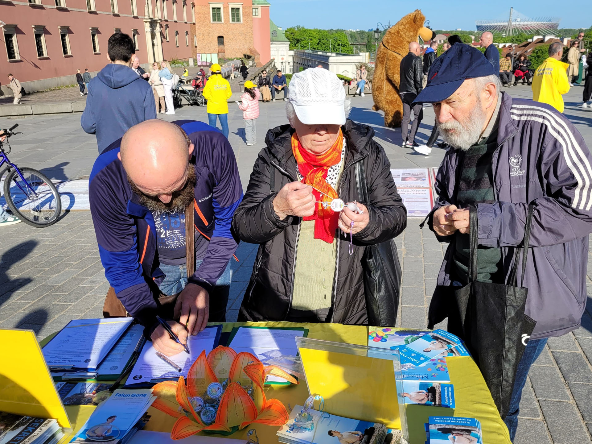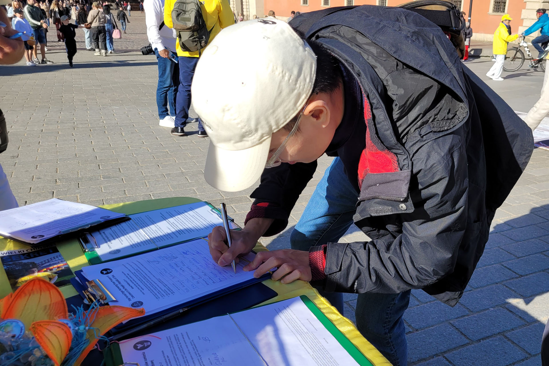 另外一位在波兰工作的中国男士主动找到法轮功学员,希望听到有关法轮功的真实声音,当听到真相的介绍和看到展板上当年真实的图片后,明白了所谓的“围攻中南海”,所谓的“天安门自焚”都是诬陷的谎言,随即毫不犹豫的在征签簿上签名,支持法轮功反迫害的正义之举,临走时双手合十致谢法轮功学员。