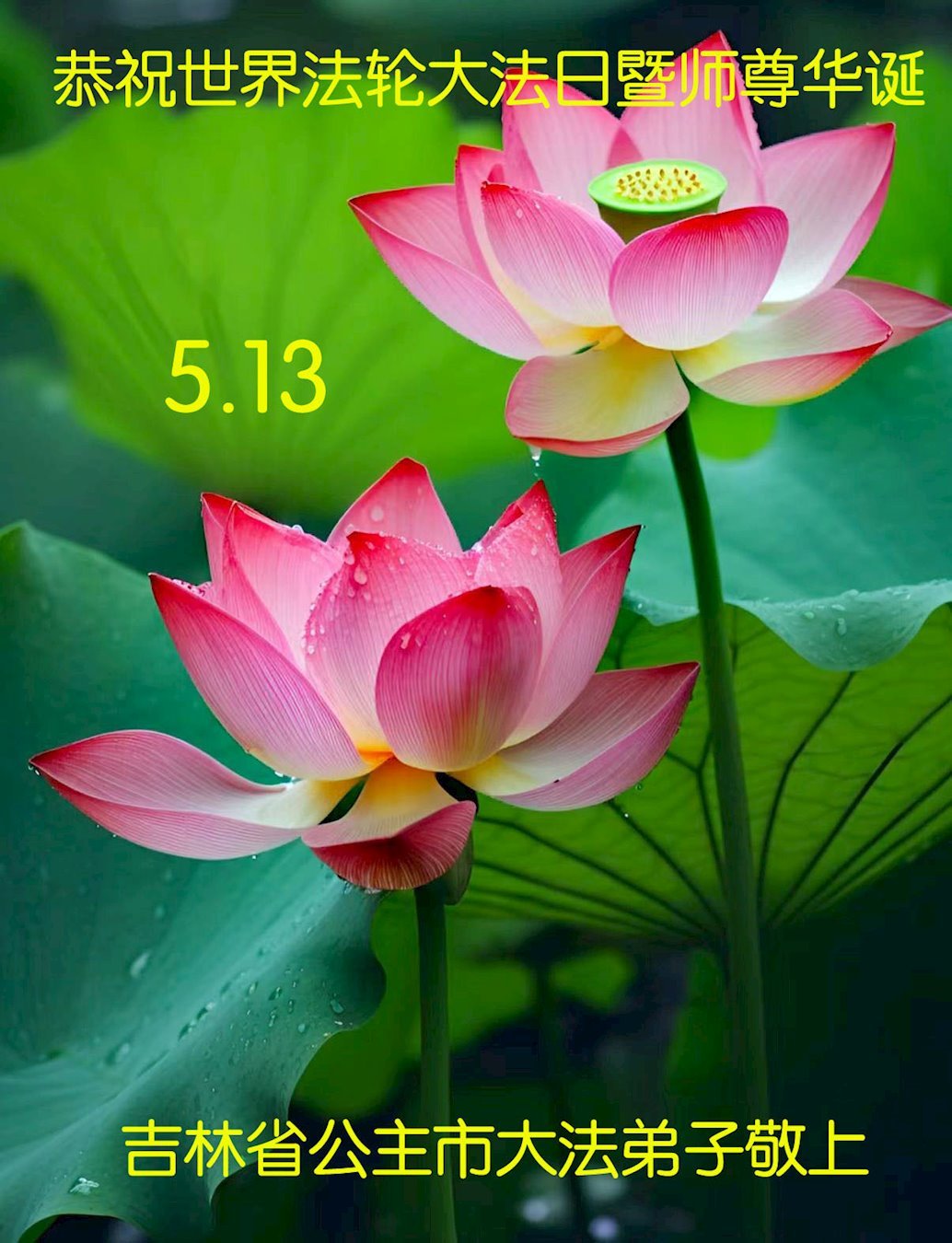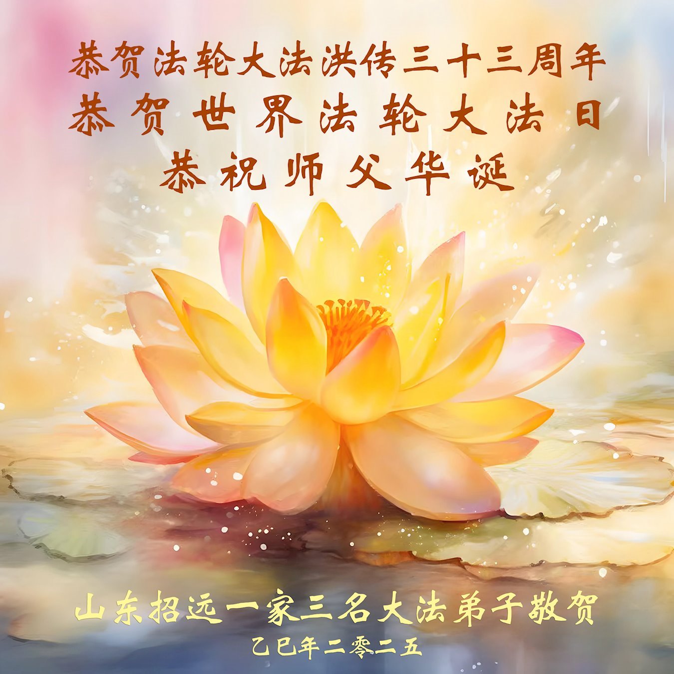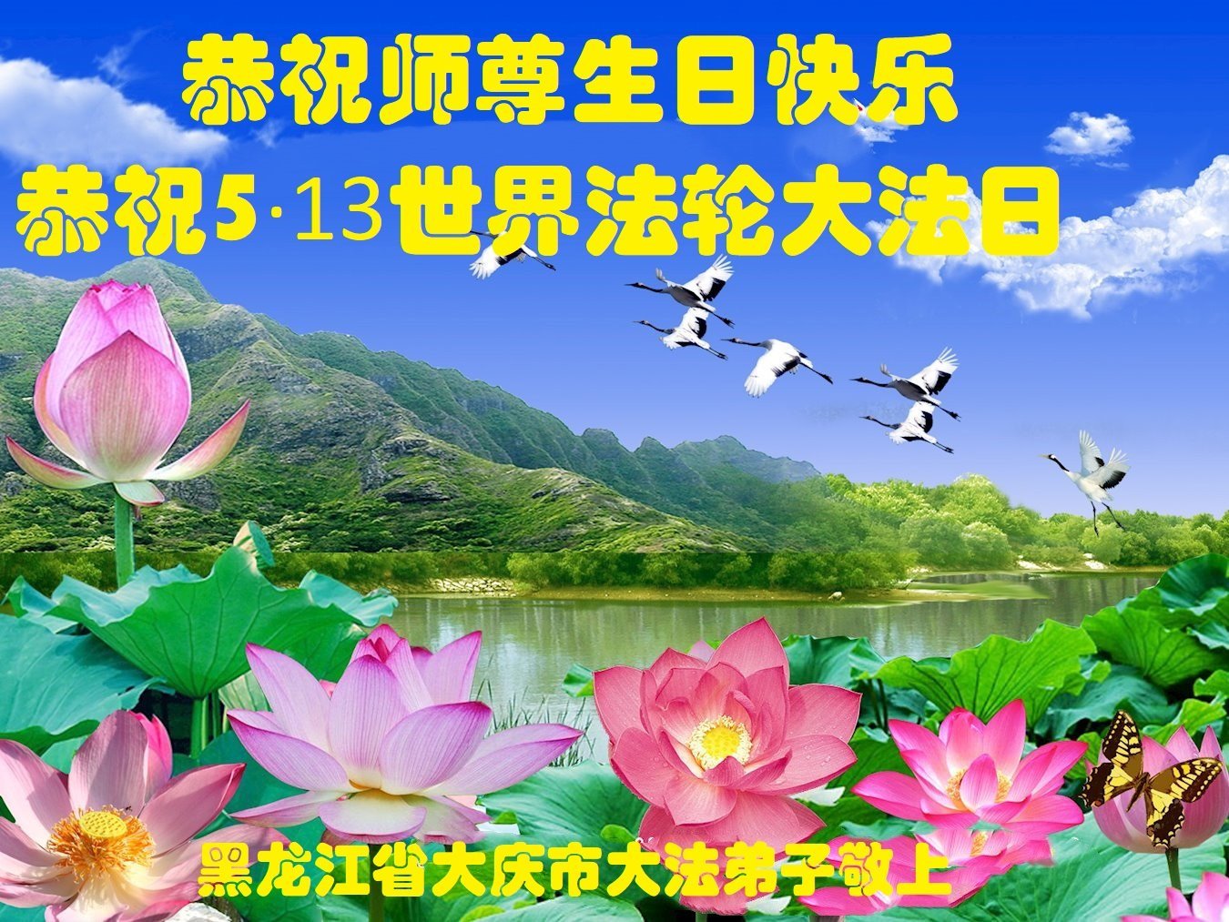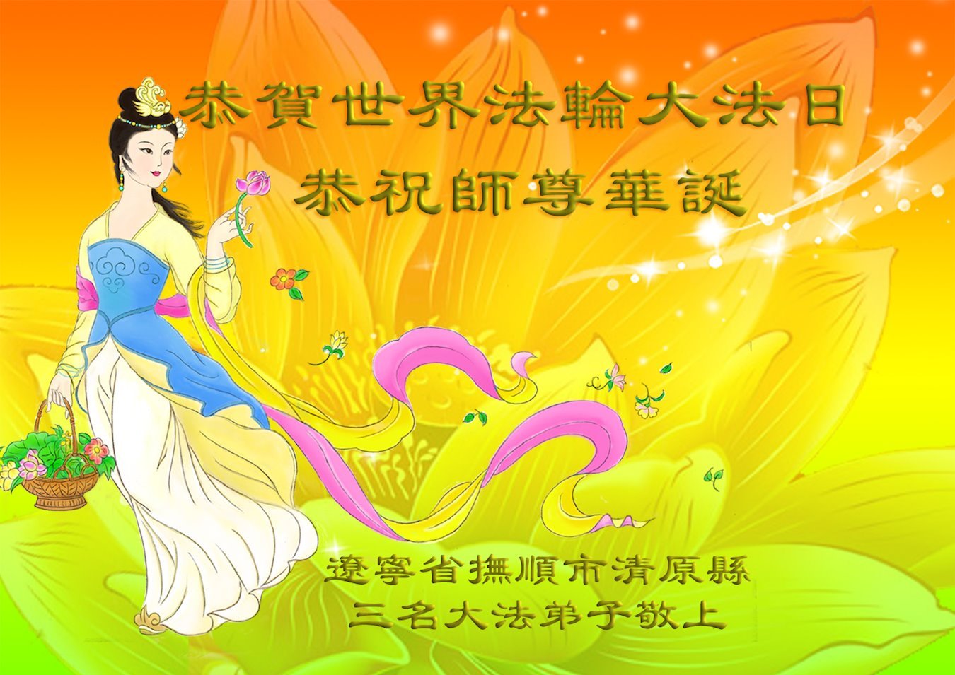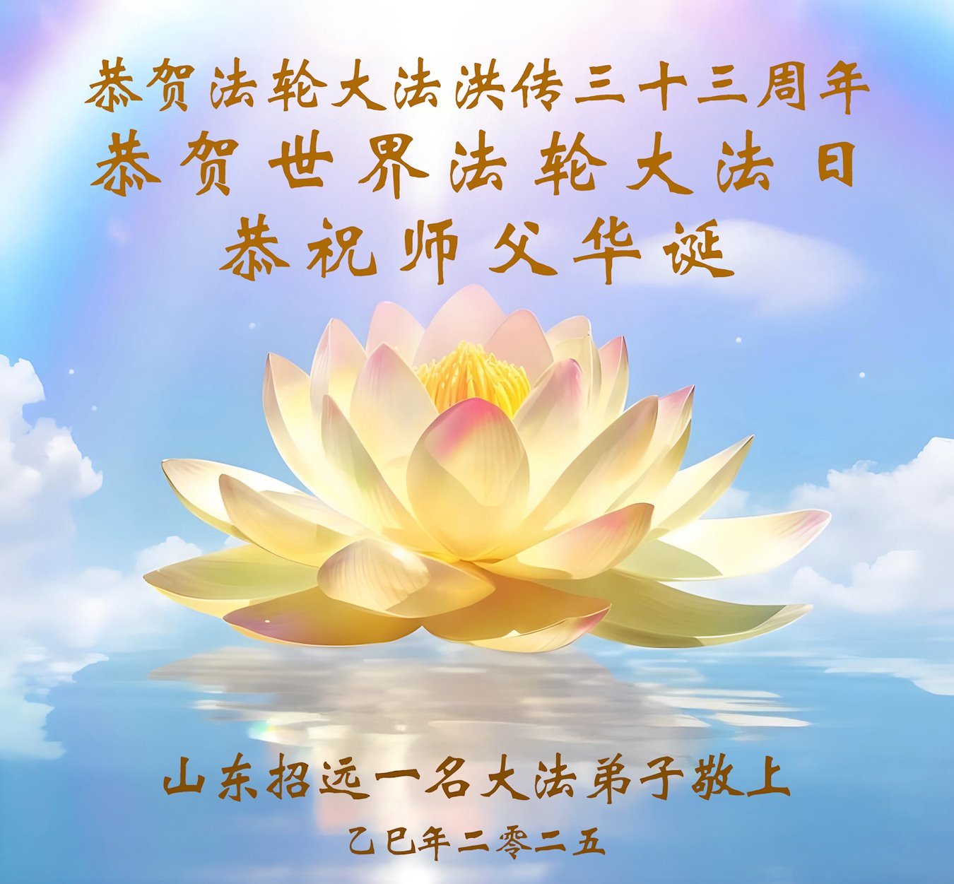 一个生命能在大法中修炼、升华,是无上的荣耀,无论经历多少艰难困苦,一颗坚修大法的向善之心永恒不变。在世界法轮大法日暨师尊华诞来临之际,弟子以最恭敬之心,叩谢师尊的恩典、向师尊献上最真诚之祝福:恭祝师尊生日快乐!师尊您辛苦了!愿真善忍之光照亮整个世界,愿法轮大法早日普照华夏大地!