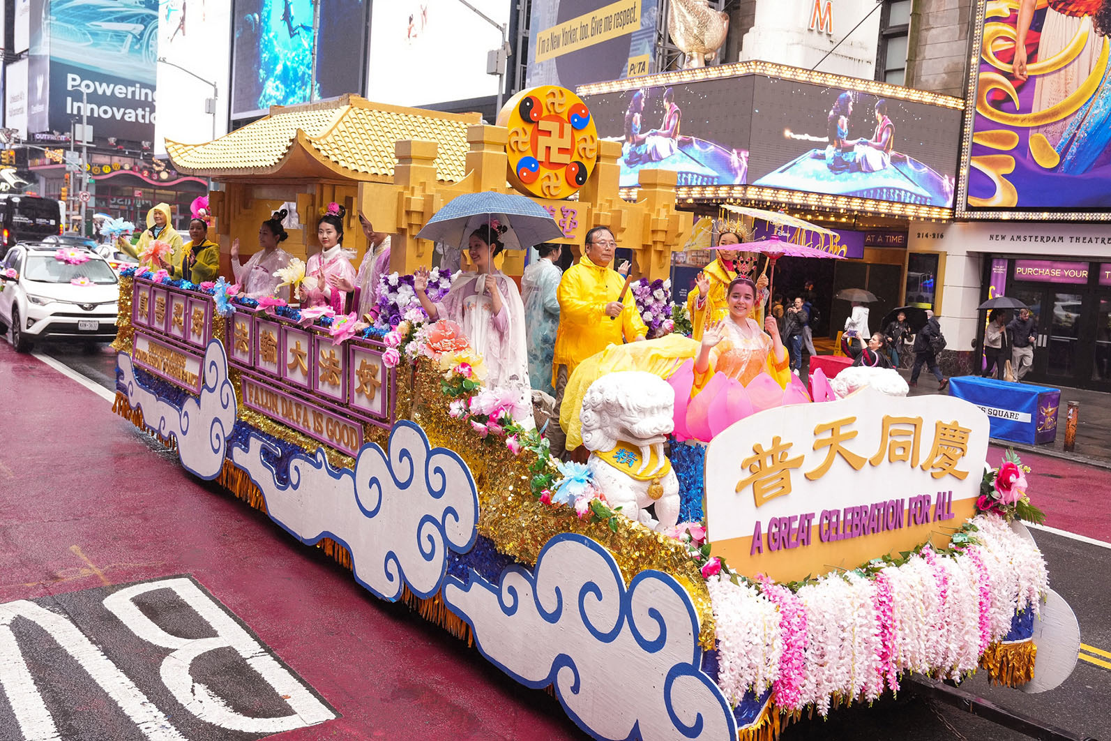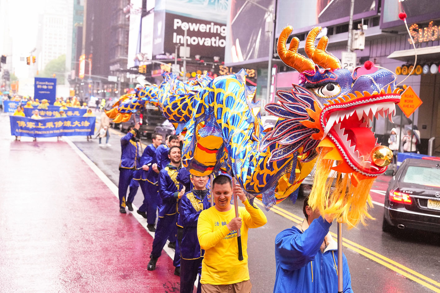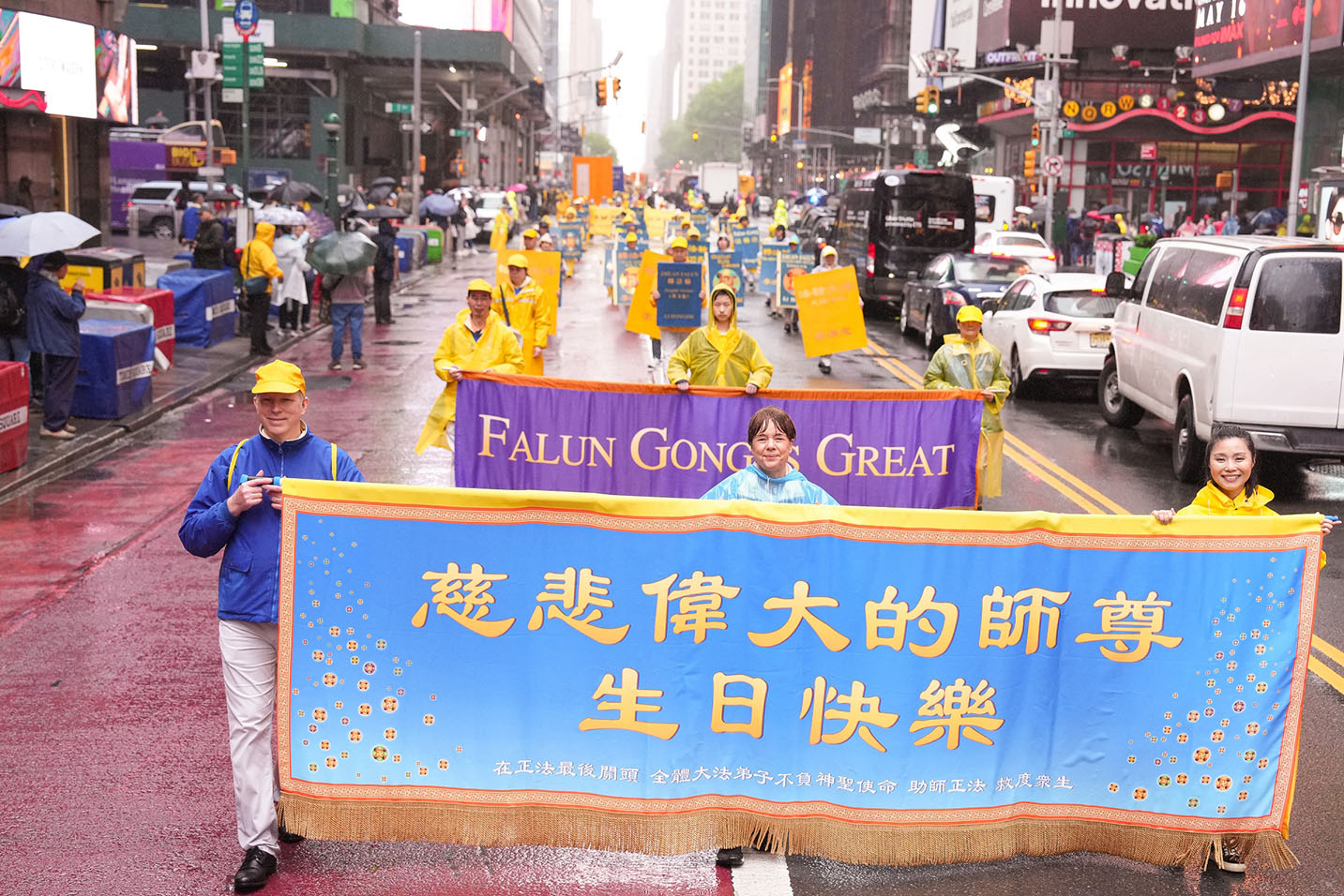 今年的春天忽冷忽热,近两个星期不断下雨,游行的这个星期五也不例外。法轮功学员的庆祝游行,时长两个多小时,队伍绵延数公里,沿途吸引了纽约各族裔人士的驻足观看。人们纷纷对学员风雨中坚持游行表示感佩。很多上班族行色匆匆,但当充满喜庆、希望和意志力的游行队伍经过时,他们也纷纷停下脚步观看,并惊叹于游行展现的美好与平和。