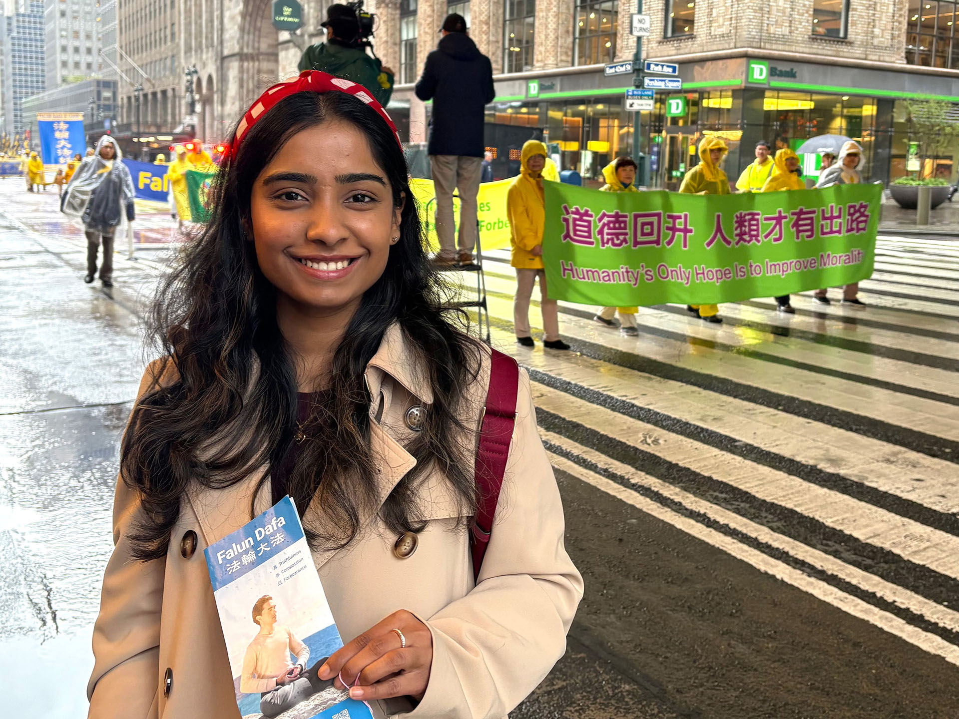 贾恩看到游行队伍中的功法演示,感到炼功动作看起来简单易学,她也想找机会学炼,特别提到自己虽然年轻,但也有背痛等烦恼。她说:“我不知道有这么多人在炼(法轮功),听说他们在蒙特利尔也有教功班,免费而且容易学炼,我也想学。能帮助连结精神和身体,让人更真诚,更能忍耐。”