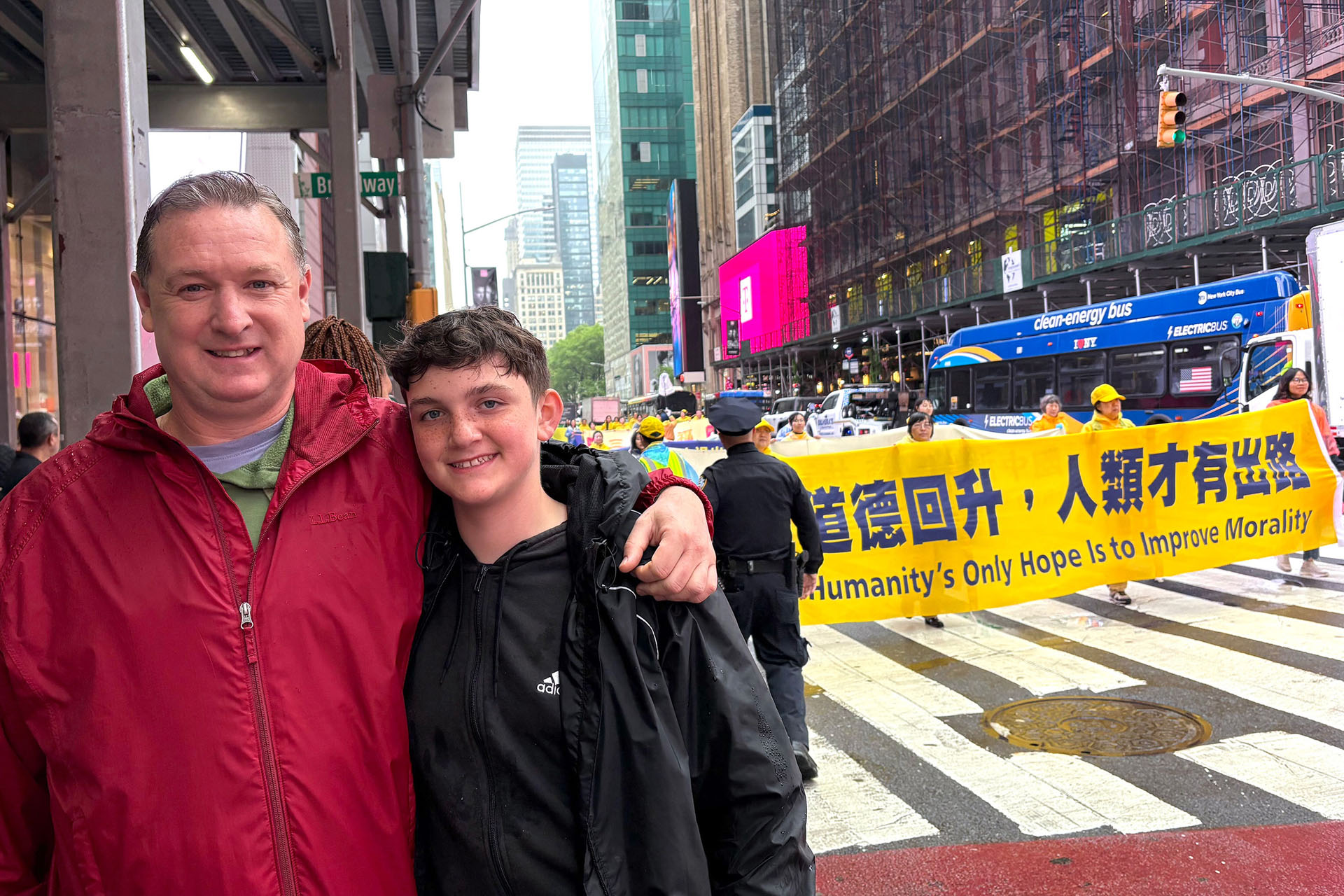 克雷格·多纳休(Craig Donahue)是加拿大一家酿酒厂的老板,带着侄子来纽约观光。他很欣慰在这样的阴雨天气,能看到法轮大法的盛大游行。在观看游行时,他感到法轮功学员发自内心的喜悦和友好,“整齐的队伍,还有他们的友好、平和与彬彬有礼都令人赏心悦目。”“我看到很多人在微笑和挥手,都很快乐,能感到他们的那种自豪。”