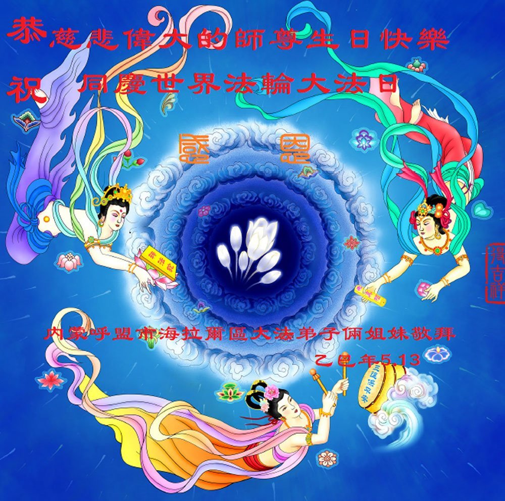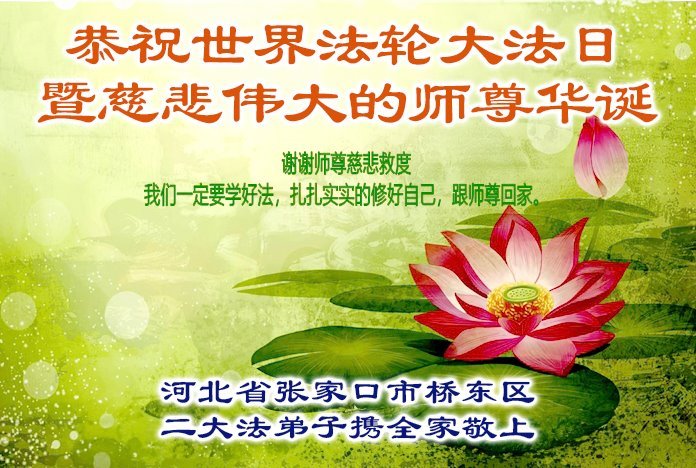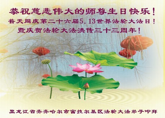 第二十六届世界法轮大法日暨师父华诞之际,同庆世界法轮大法日!恭贺师父生日快乐!师父您辛苦了!我们一定会紧紧拉着您的手,紧跟正法進程,不断提高心性,做好自己该做的事,跟师父回家!