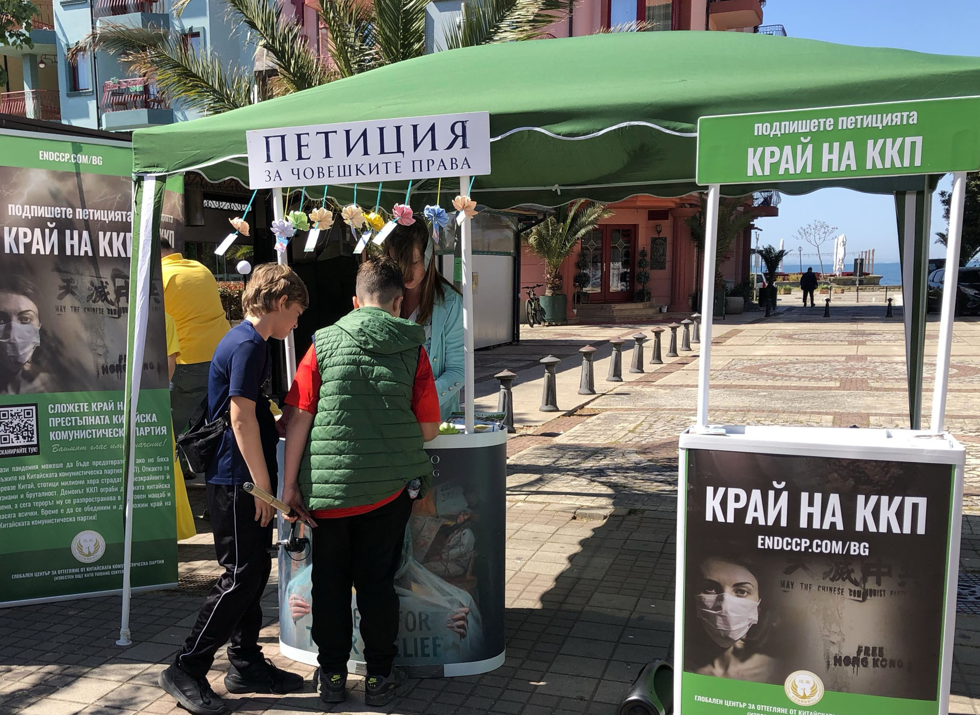 两位男孩鲁门(Rumen)和尼古拉(Nikolai)被真相横幅所吸引,直接来到信息亭向学员询问具体内容。学员向他们介绍了真相后,男孩们拿了传单准备带回家给父母看。