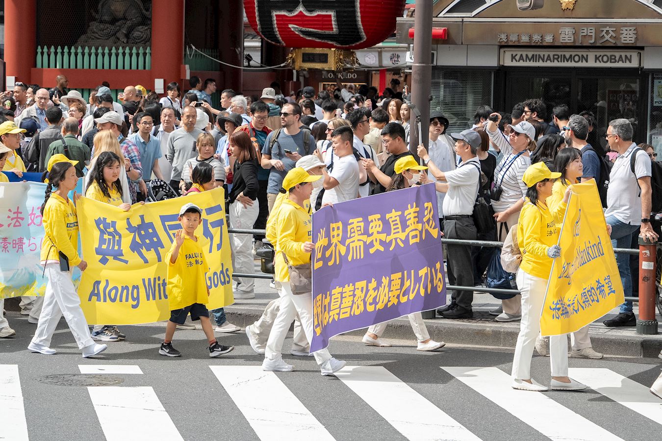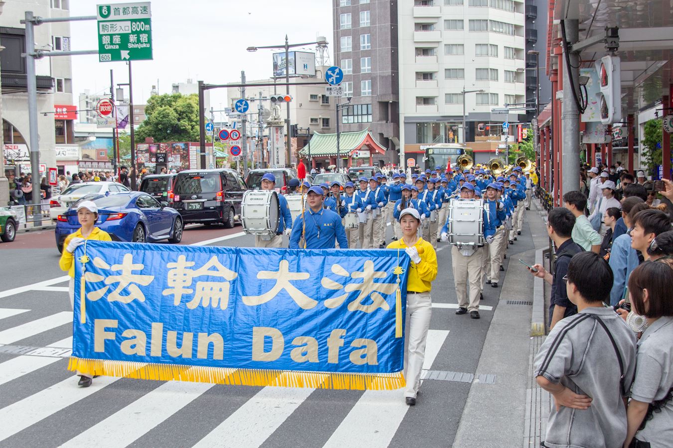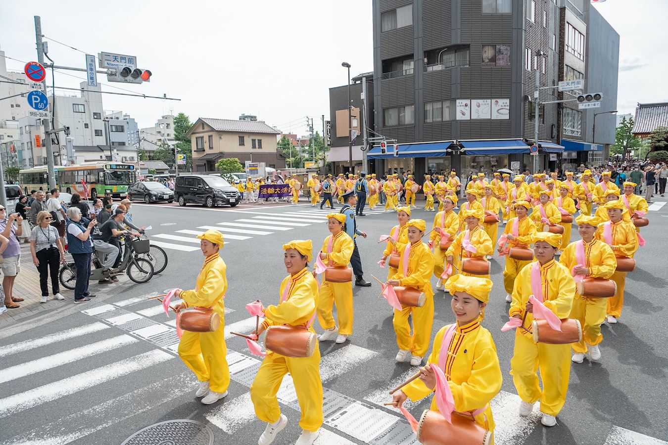 下午一点三十分,游行队伍在威武雄壮的天国乐团的领奏下,从花川户公园出发,缓缓行进约一个半小时,途经包括浅草寺雷门等观光景点在内的繁华街道,吸引沿途众多市民和游客驻足观看。