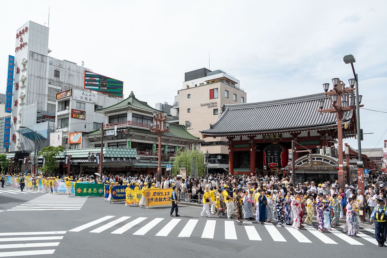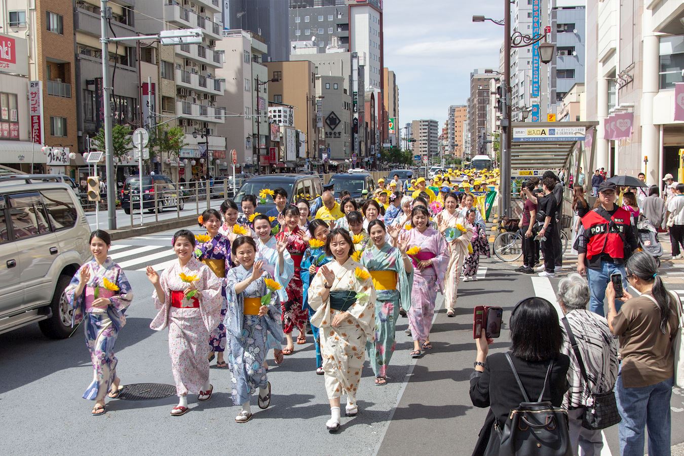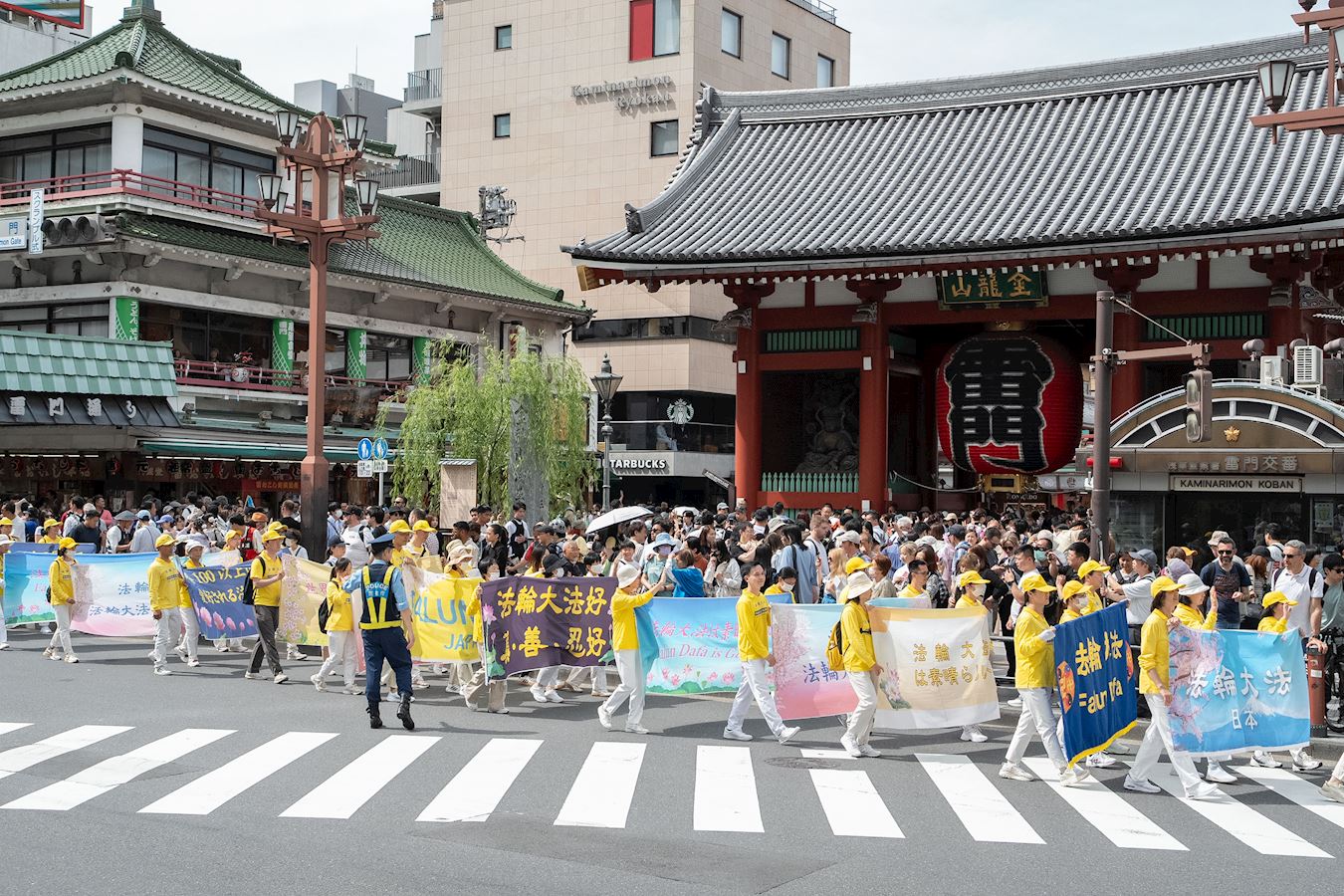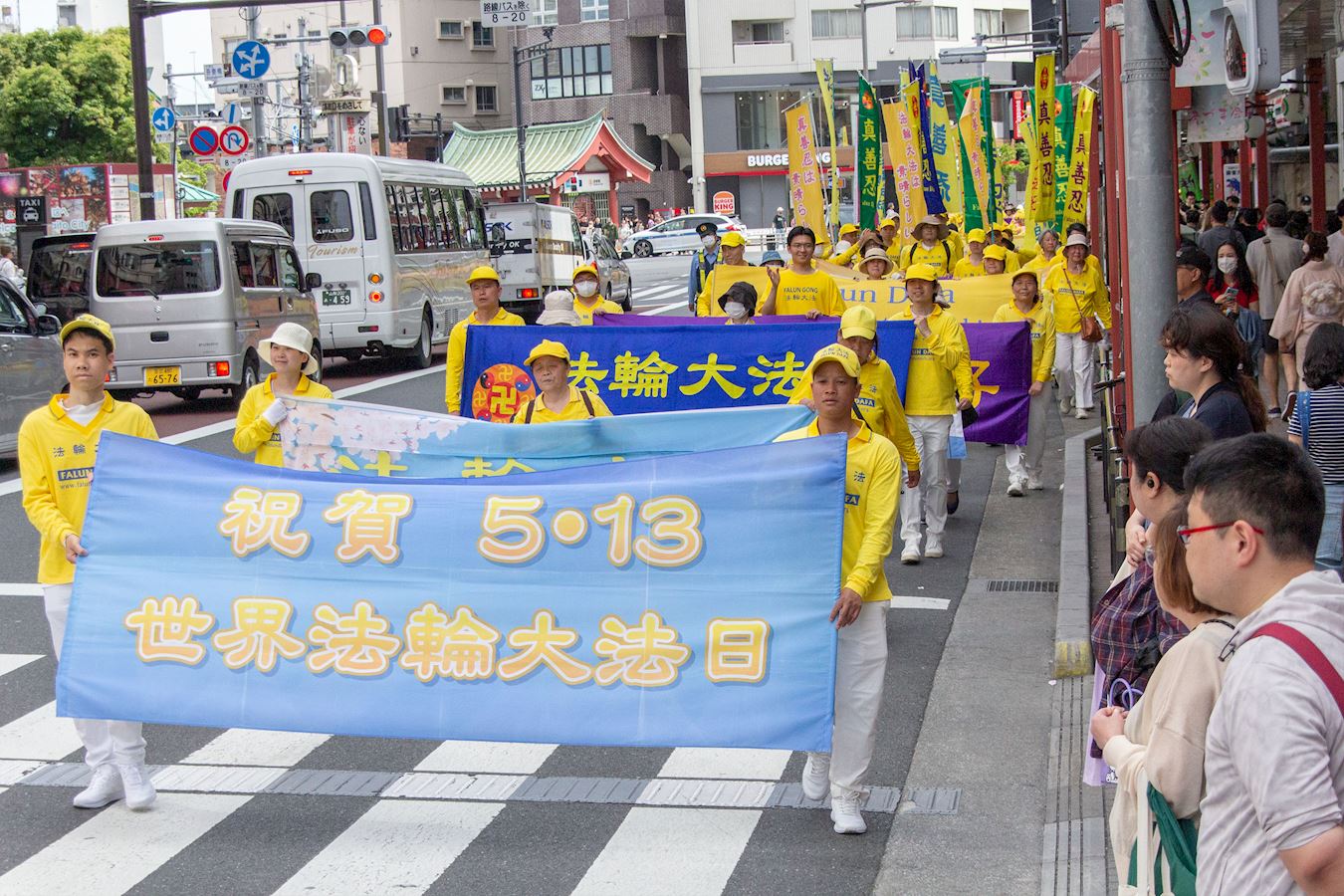 下午一点三十分,游行队伍在威武雄壮的天国乐团的领奏下,从花川户公园出发,缓缓行进约一个半小时,途经包括浅草寺雷门等观光景点在内的繁华街道,吸引沿途众多市民和游客驻足观看。