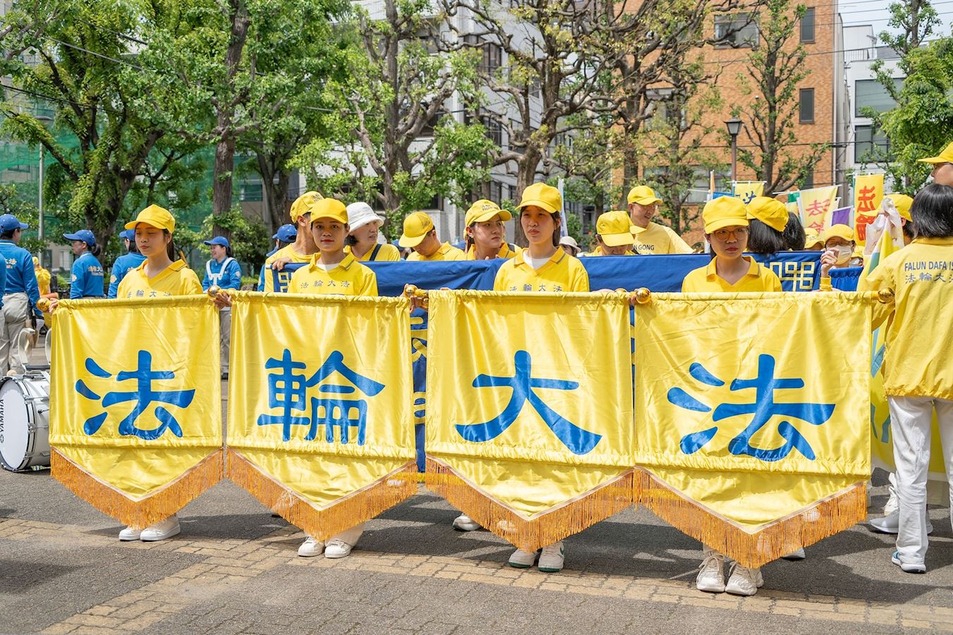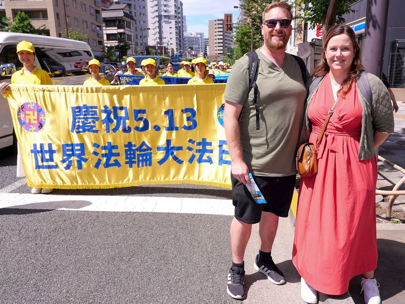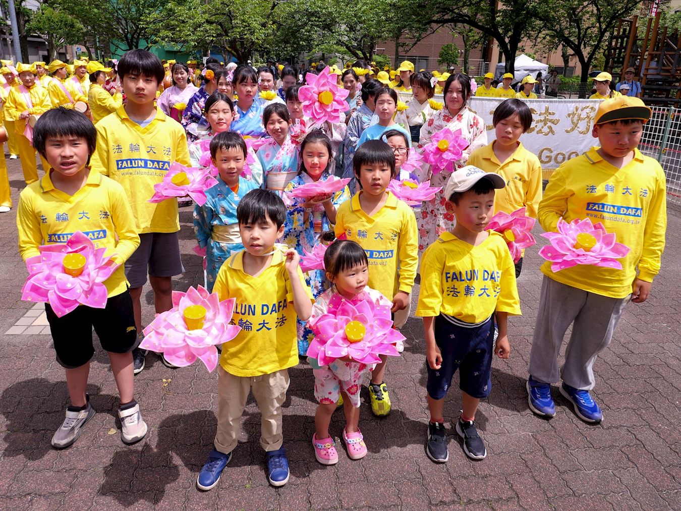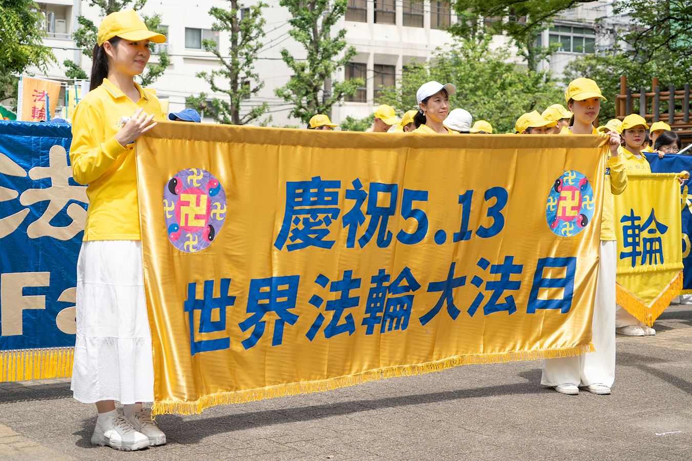 游行结束后,参加游行的日本大法小弟子们合影恭祝师父生日快乐。