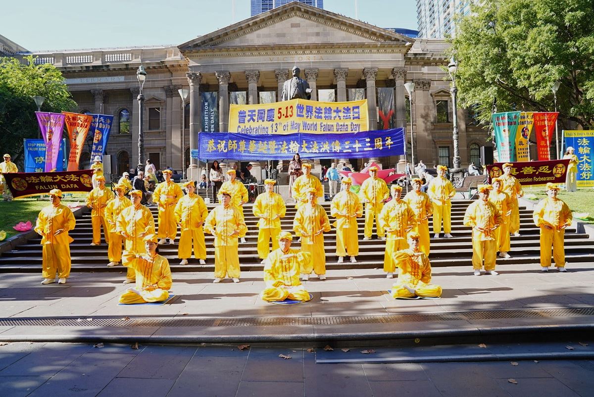 ![]() 图13~16:二零二五年五月十日下午,澳洲墨尔本部分法轮功学员在市中心州立图书馆前集会,庆祝“5‧13世界法轮大法日”,恭贺李洪志师父华诞。 |