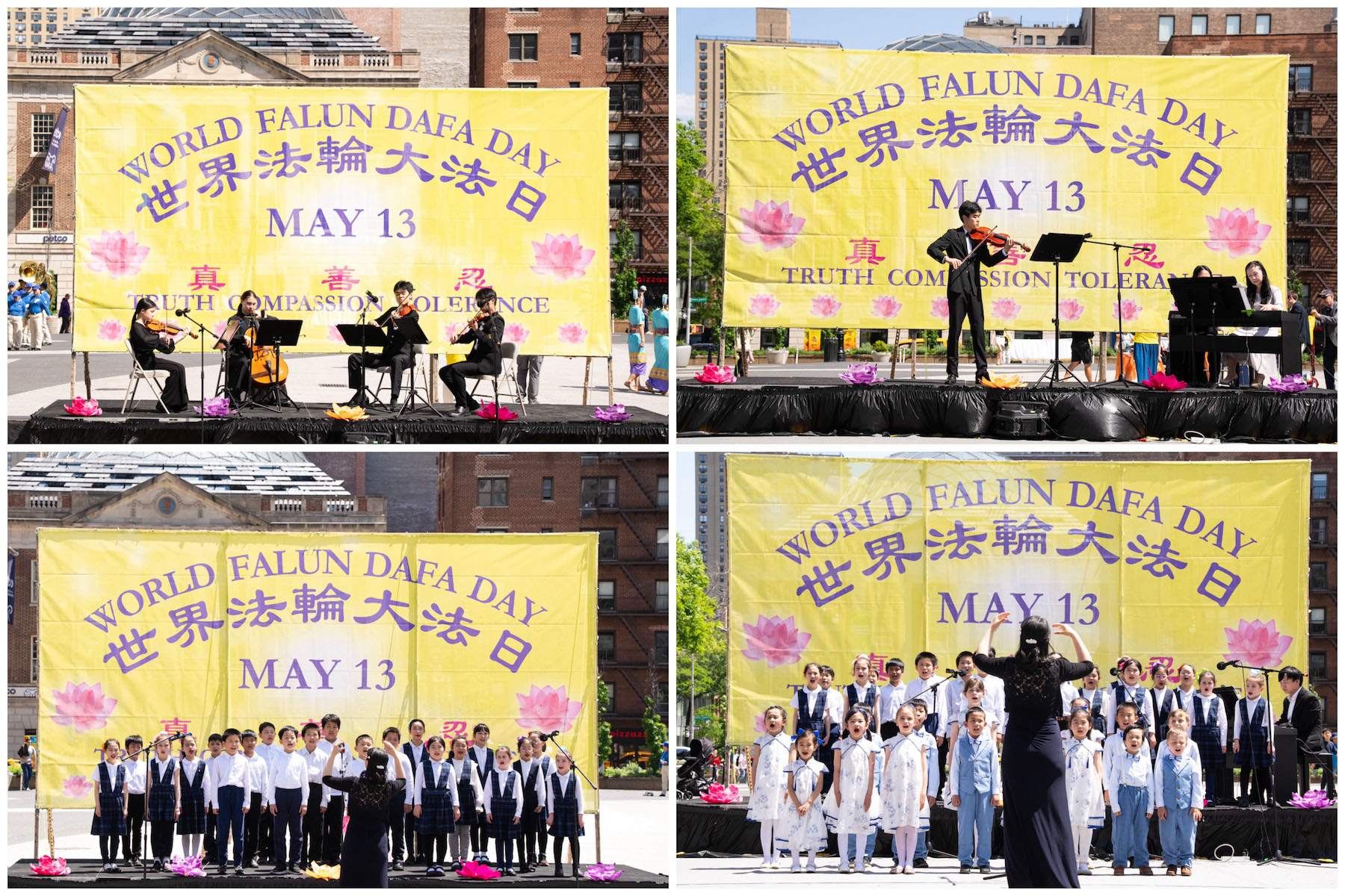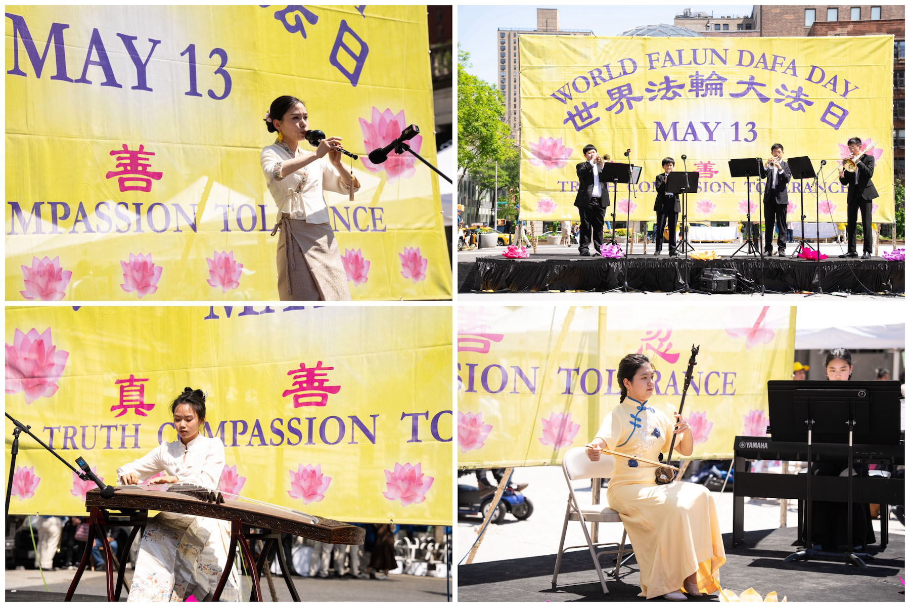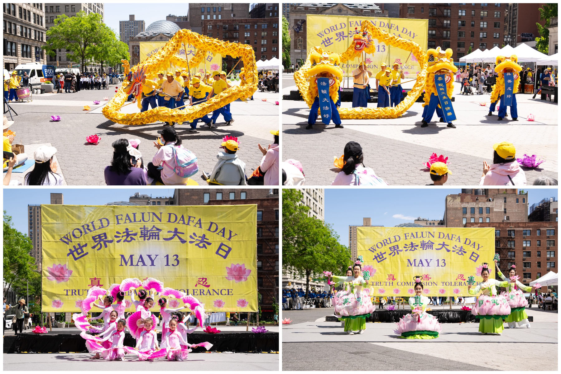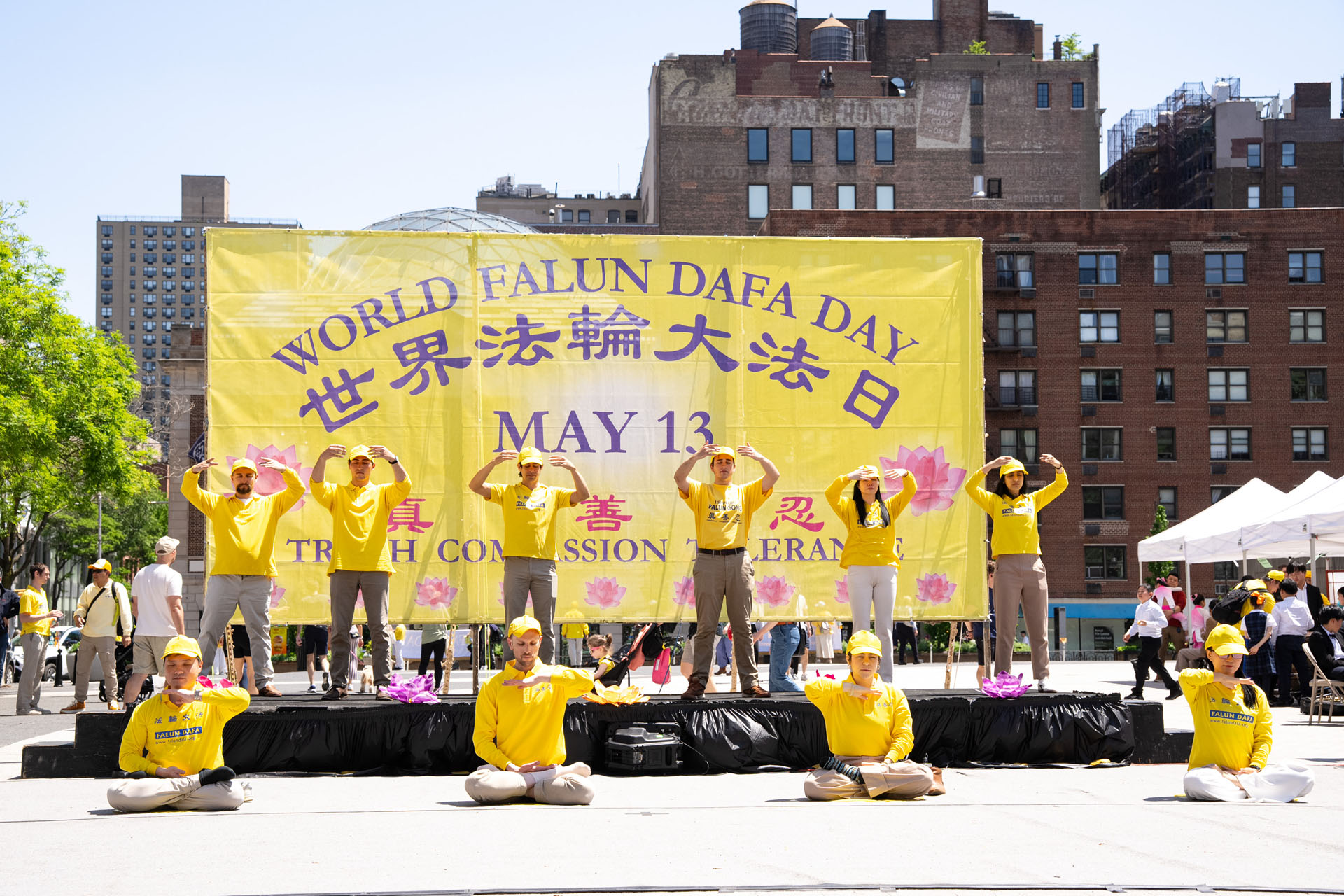 当天阳光明媚、和风轻拂,联合广场上一片喜庆。上午九点开始,学员们开始功法演示。他们来自社会上的各个领域,各个族裔,男女老少,伴随着祥和的炼功音乐,展示着平和优美的五套功法。中午十二点开始,学员们开始丰富多彩的文艺表演,向民众展现法轮大法的祥和美好,表达对师尊的无尽感恩。