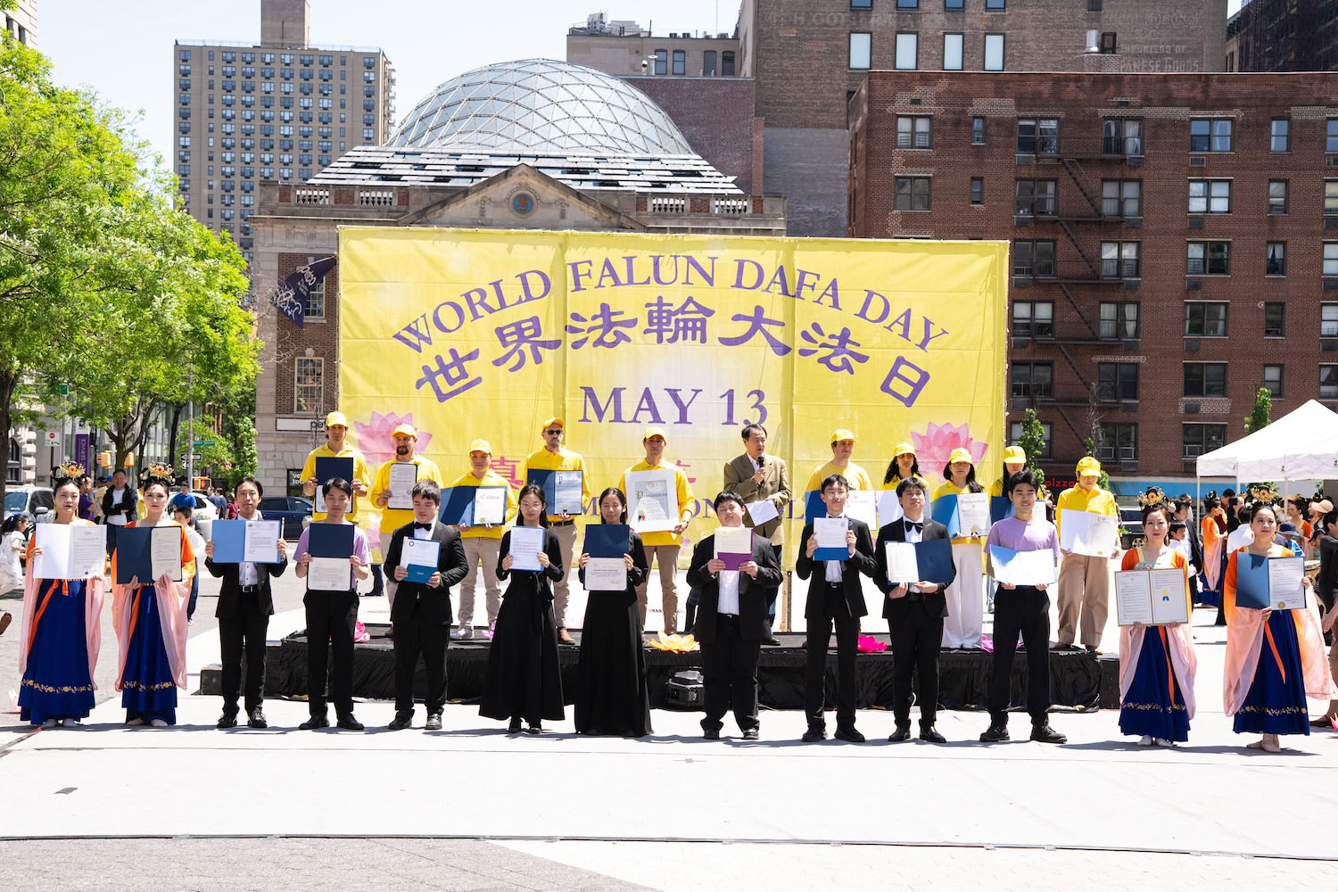 图2:纽约曼哈顿联合广场上,学员们手持各级政要褒奖