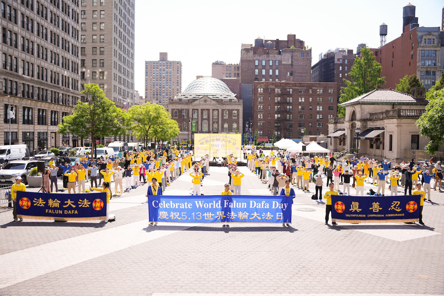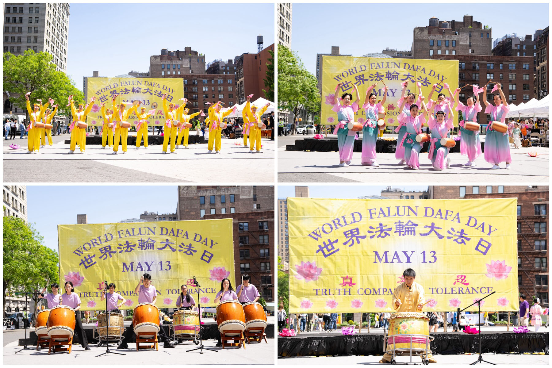【明慧网二零二五年五月十三日】二零二五年五月十一日(周日),纽约曼哈顿的地标之一——联合广场上欢声笑语,美丽的金黄色大型画布上写着中英文“世界法轮大法日”,画布前的舞台上法轮功学员盛装而舞,恭祝慈悲伟大的师尊华诞快乐,喜迎第二十六届世界法轮大法日——二零二五年五月十三日,及法轮大法弘传世界三十三周年。