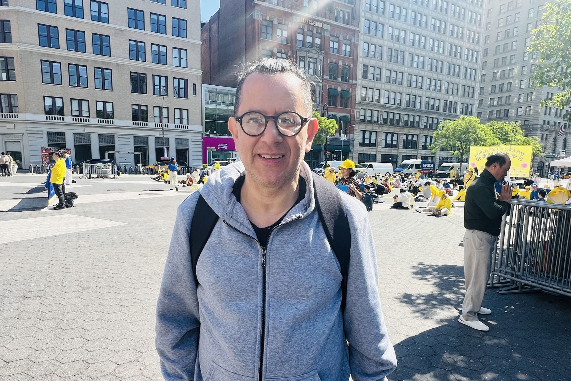 罗约拉(Miguel Loyola)当天路过联合广场,首次接触法轮功,当场跟随学员学习了法轮大法的炼功动作。他表示,自己在剧场专门研究表演与身体语言这一领域,这种在祥和的音乐中缓慢圆的功法吸引了他,“这种炼功方式能开启人的内在,让人从原有的情绪中解放出来,发现自己其实拥有各种情感,甚至是他们原以为不存在的那种。”
