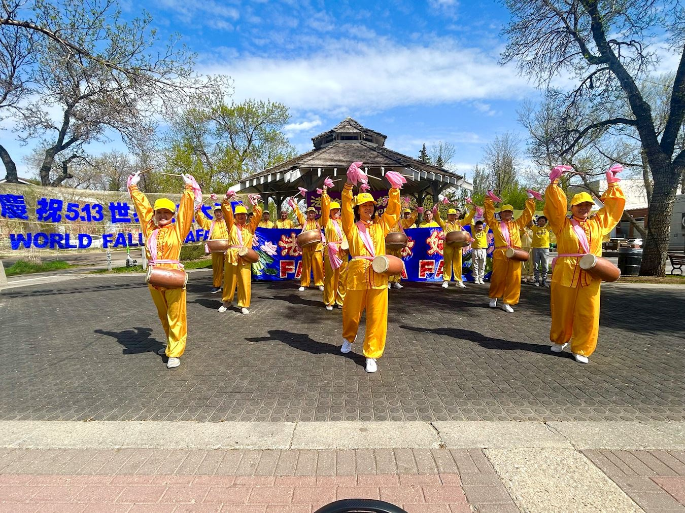 庆祝活动当天,春暖花开,阳光和煦。随着腰鼓队欢快的鼓点和音乐,路人微笑着驻足 观看,有的举起手机拍照。