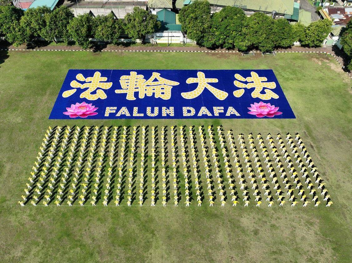此次排字的图案长58米、宽20.5米。由上百名学员们组成“法轮大法”四个汉字。学员们身穿黄色与白色服装,按照顺序进入场地,静静地站在指定位置,场面庄严祥和。