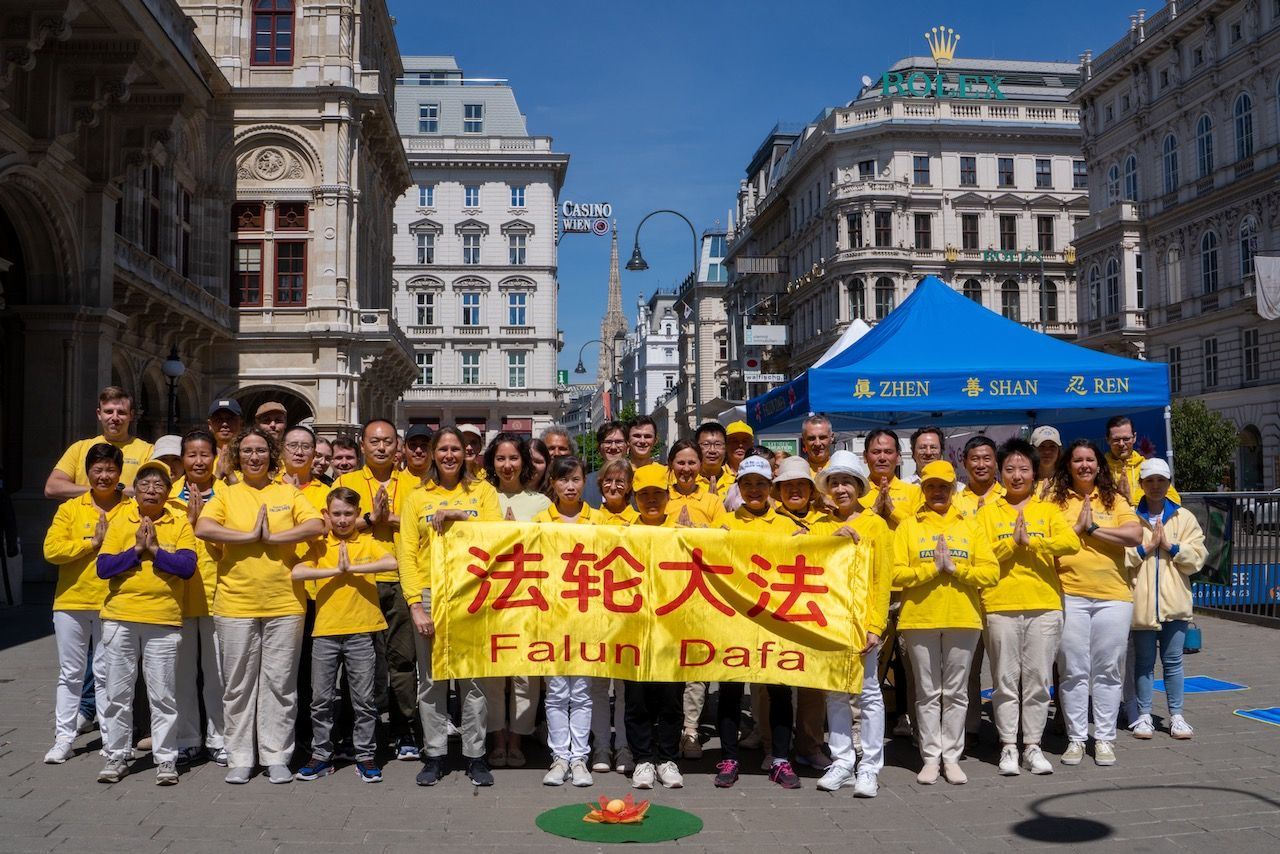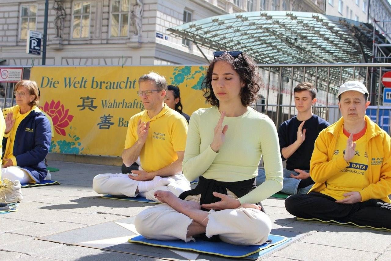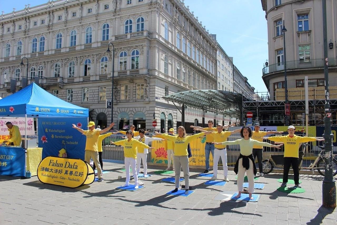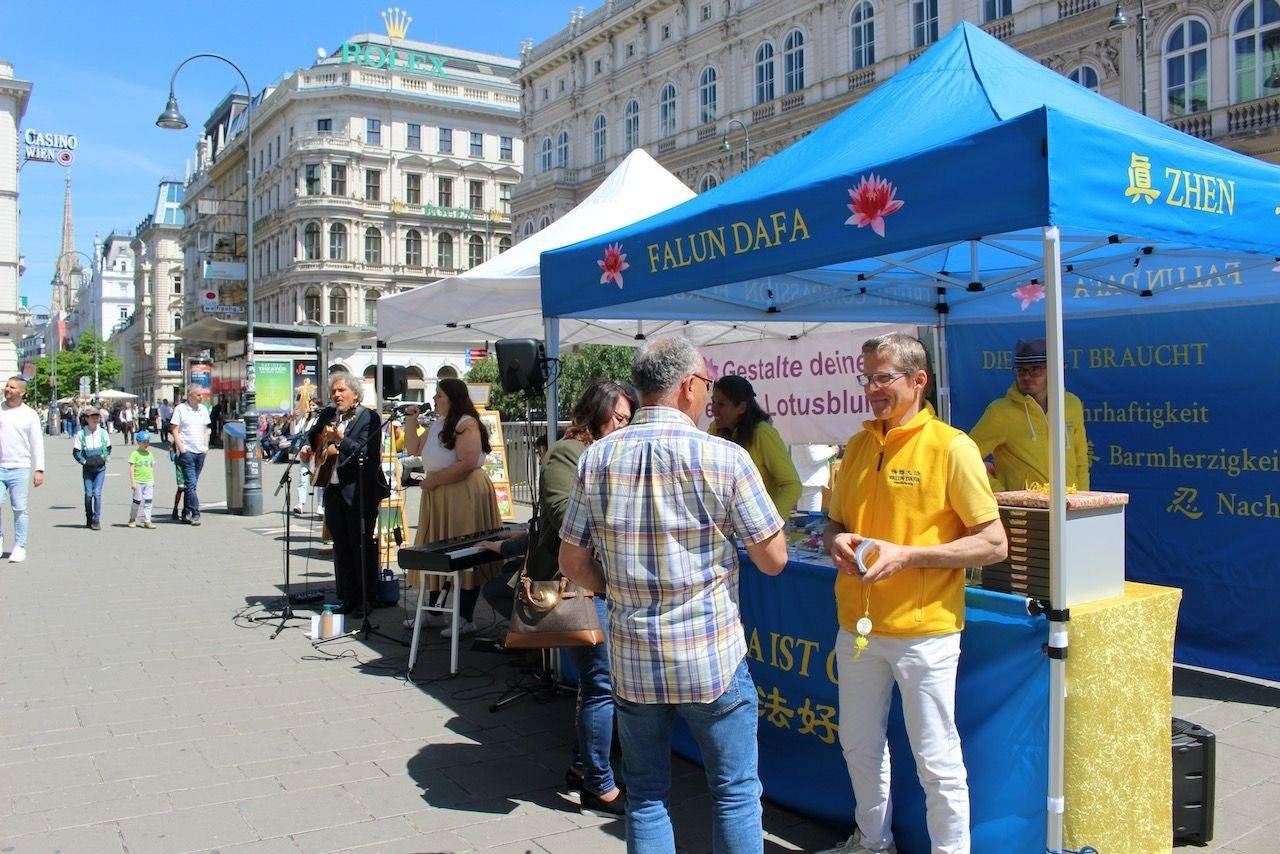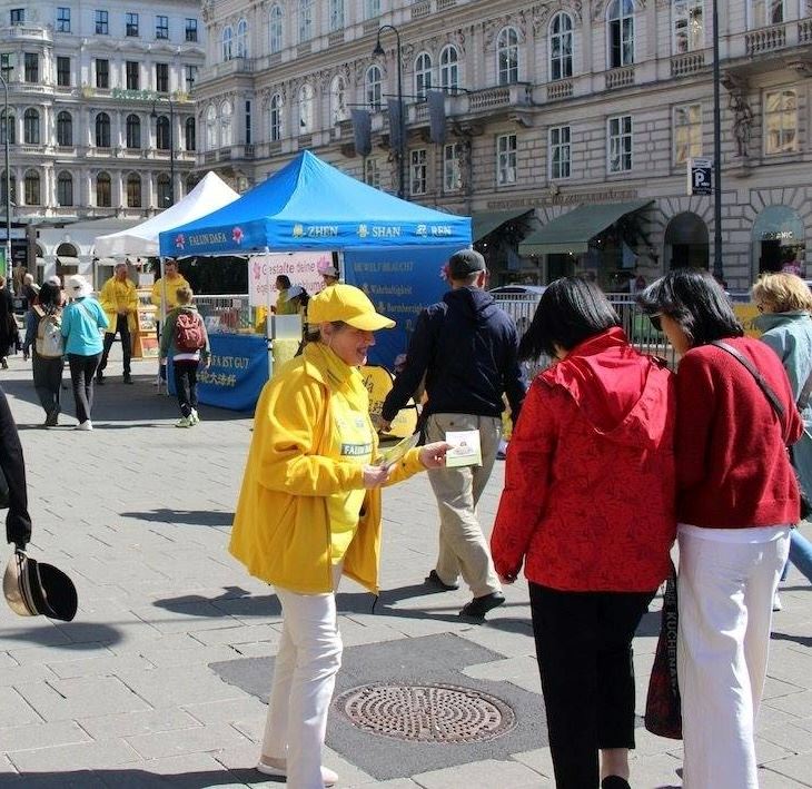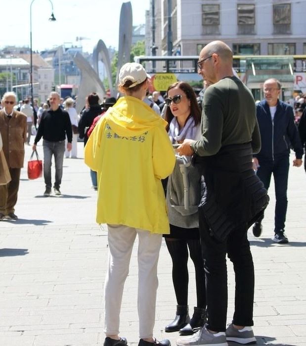 一位曾经在香港了解过法轮功真相的中国小伙子来到信息台。他尝试学习了功法动作,他感受到自己的思维变得更加清晰。他询问在维也纳哪里可以找到炼功点,学员告诉他在维也纳的城市公园每天都有学员在那里炼功。与他一起来到信息台的同伴以前没有亲身接触过法轮功,所以借此机会询问了很多关于法轮功的真相。