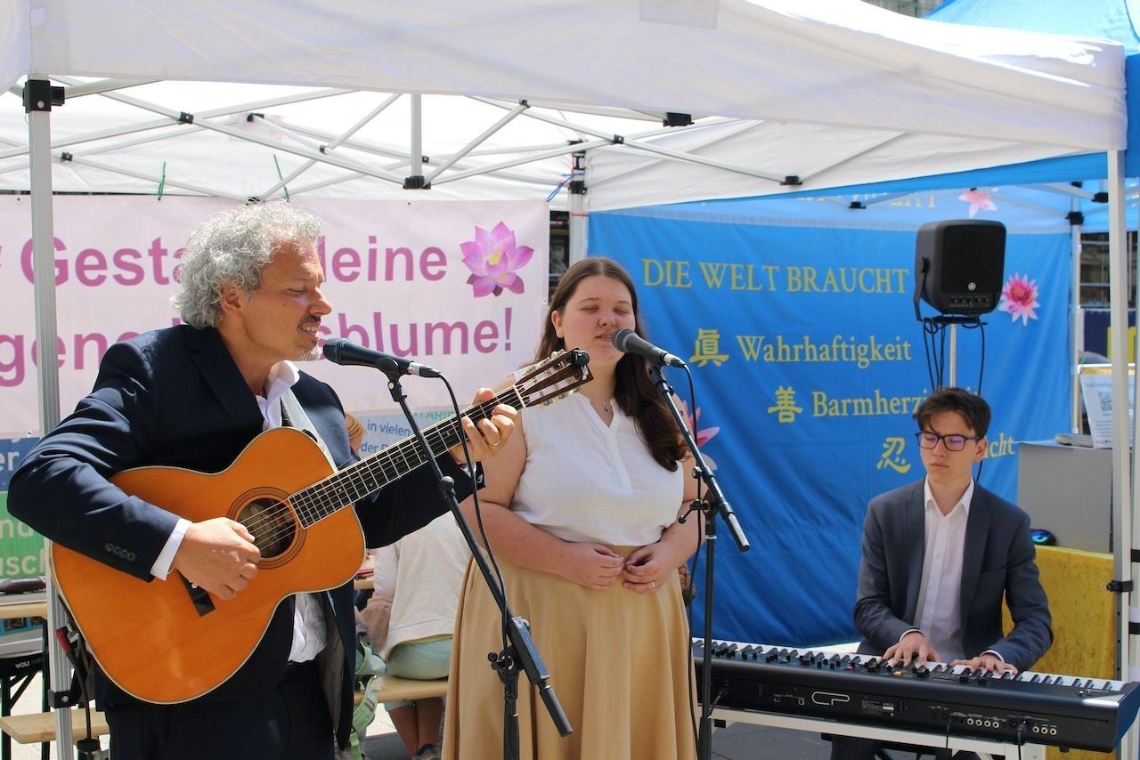 沐浴着明媚的阳光,法轮功学员亚历克斯(Alex)、格洛丽亚(Gloria)和恩里科(Enrico)演唱了悦耳动听的歌曲,颂扬法轮大法的美好。他们也希望可以通过这种方式,呼吁结束在中国大陆对法轮功的迫害。