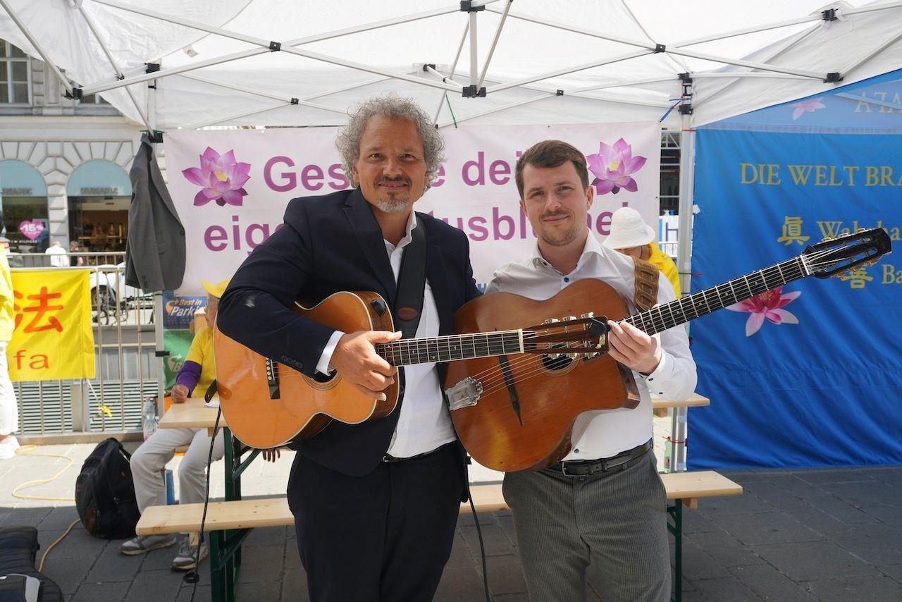 随后,亚历克斯与著名吉他手迪克努·施内伯格(Diknu Schneeberger)一起演奏。他们的音乐明亮轻快,让人感受到法轮大法修炼的深层喜悦。