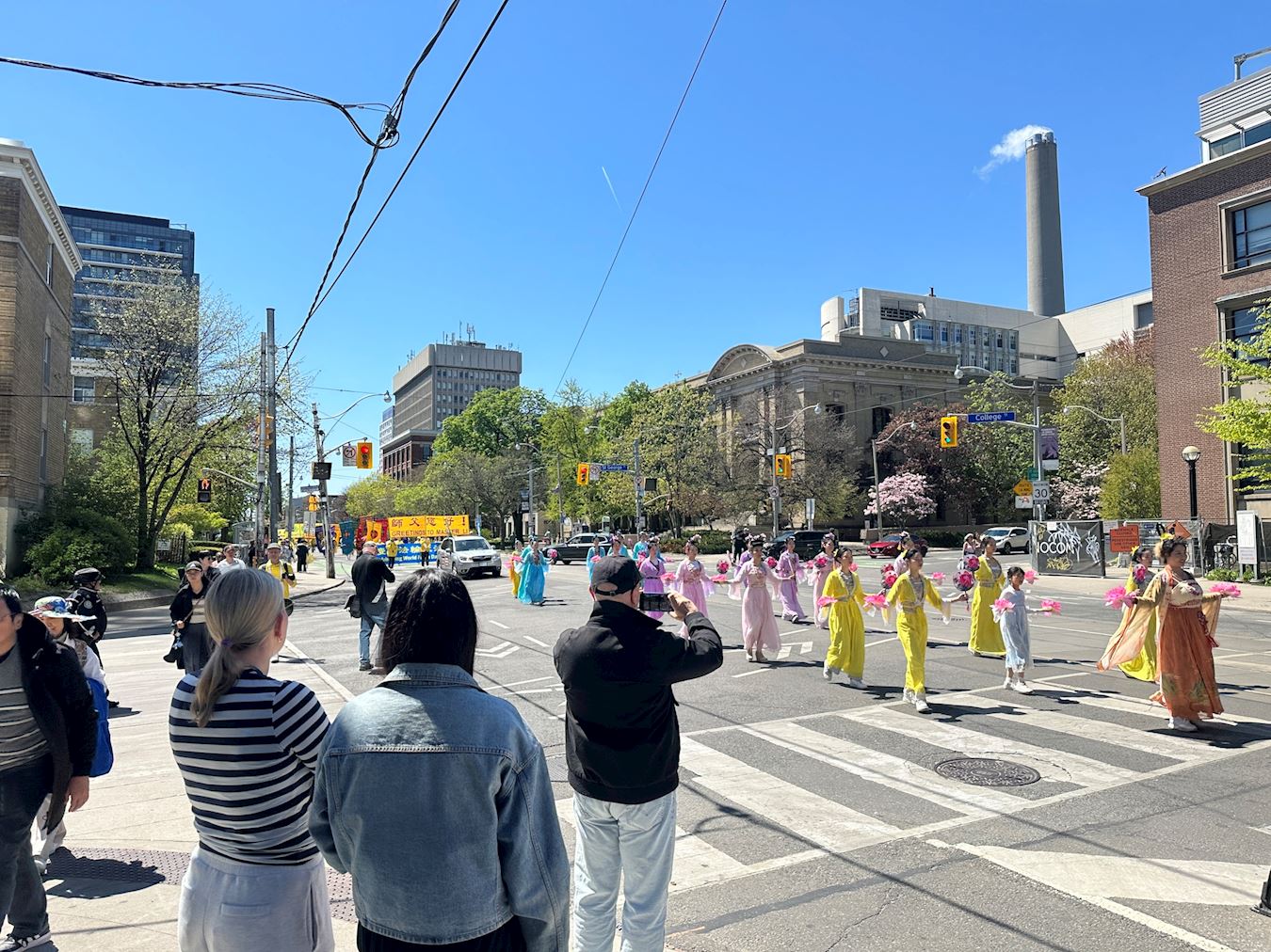 初春的多伦多阳光明媚,街道上花草繁盛,人们纷纷在外享受这美丽的春光。市民们和来自各国的游客都被这盛大的游行队伍所震撼,有的人为其拍照,有的人被其平和而美好的气氛所吸引,还有的人听完学员的介绍后,表示要去大法网址做更多了解。