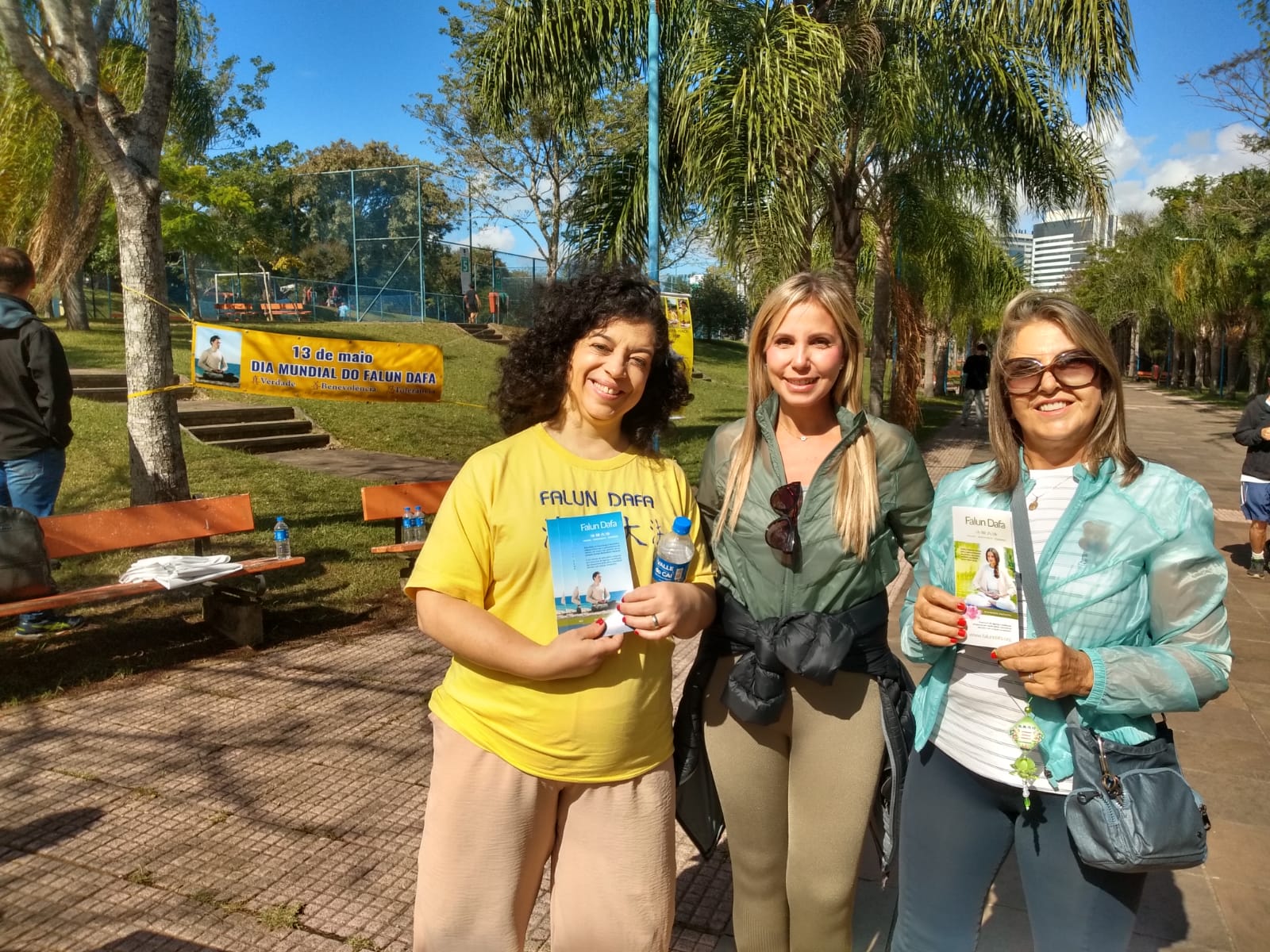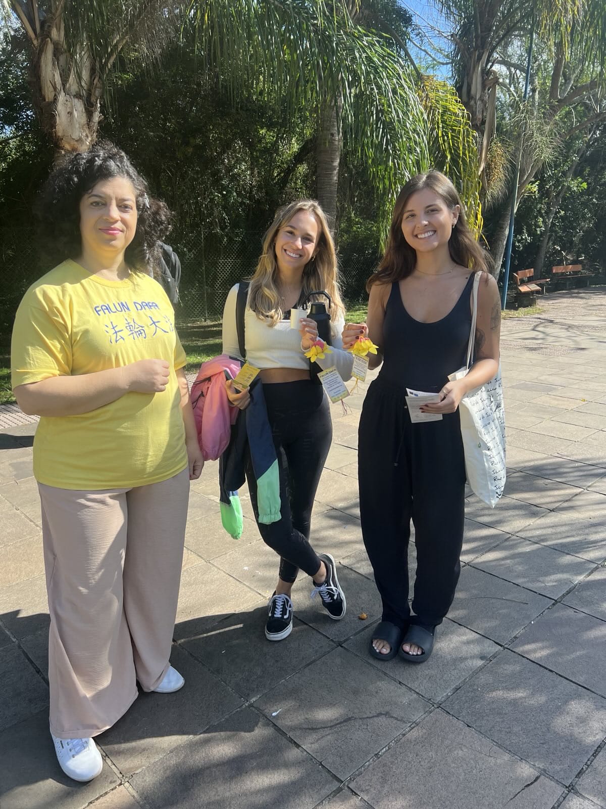 年轻的母亲露伊萨(Luisa) 带着两个女儿,她从外州来探亲,两个女儿非常喜爱这个场,站在真相资料桌子旁边,看学员们炼功,母亲也走过来,当她听到每人都要遵照真善忍来指导生活中的一切时,非常开心的笑着点头,并对女儿们说:“听到了吗?,一定要记住真善忍,神灵会保佑我们。”女儿们使劲的点头,拿着小莲花爱不释手。母亲还询问她的城市有无炼功点,学员告诉她上法轮大法网站,有书、有教功视频,在家就可以学炼,将来教其他人学,她连连说:“好 好 好!”