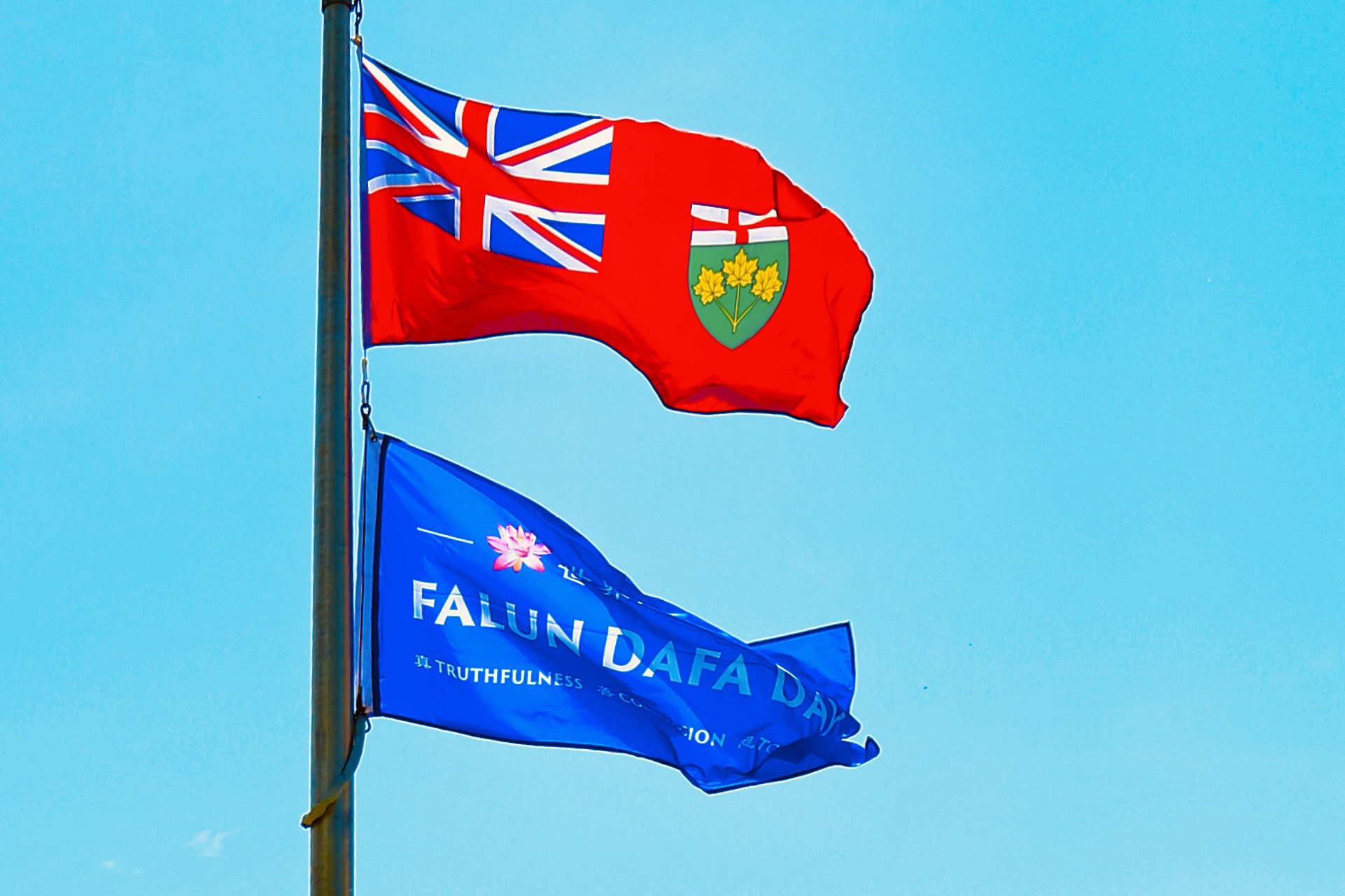 ![]() 图2:法轮大法的旗帜飘扬在加拿大安大略省康沃尔市政厅上空。 |
