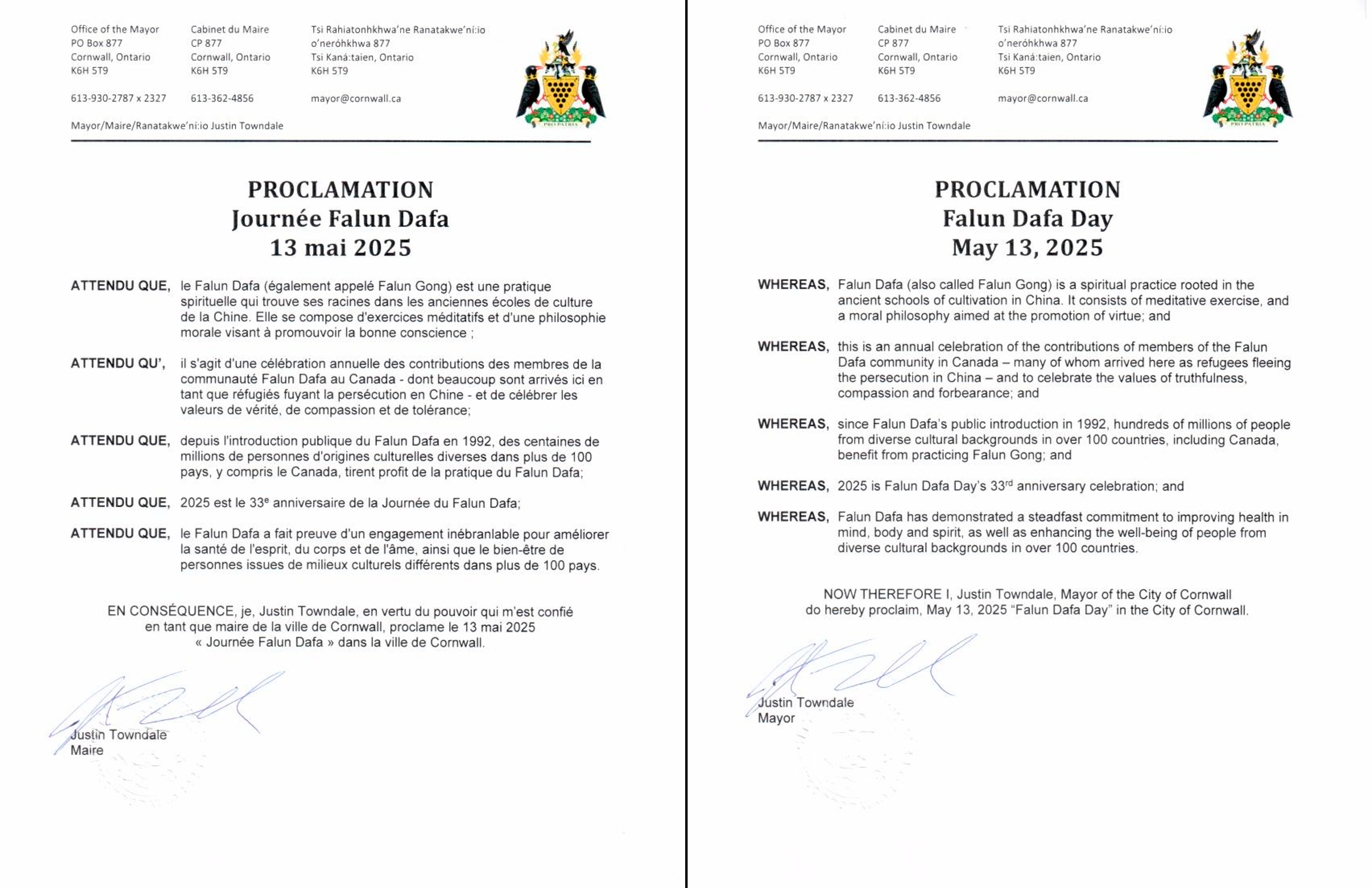 现在,我,康沃尔市市长贾斯汀·汤戴尔,特此宣布 二零二五年五月十三日为“法轮大法日”。