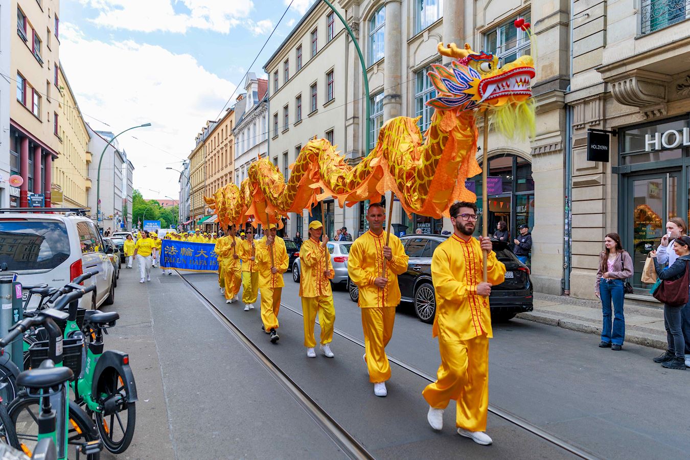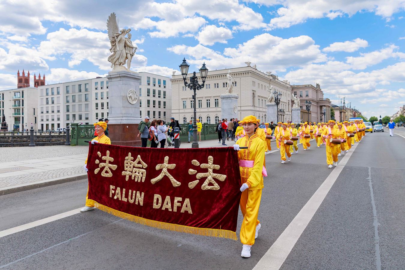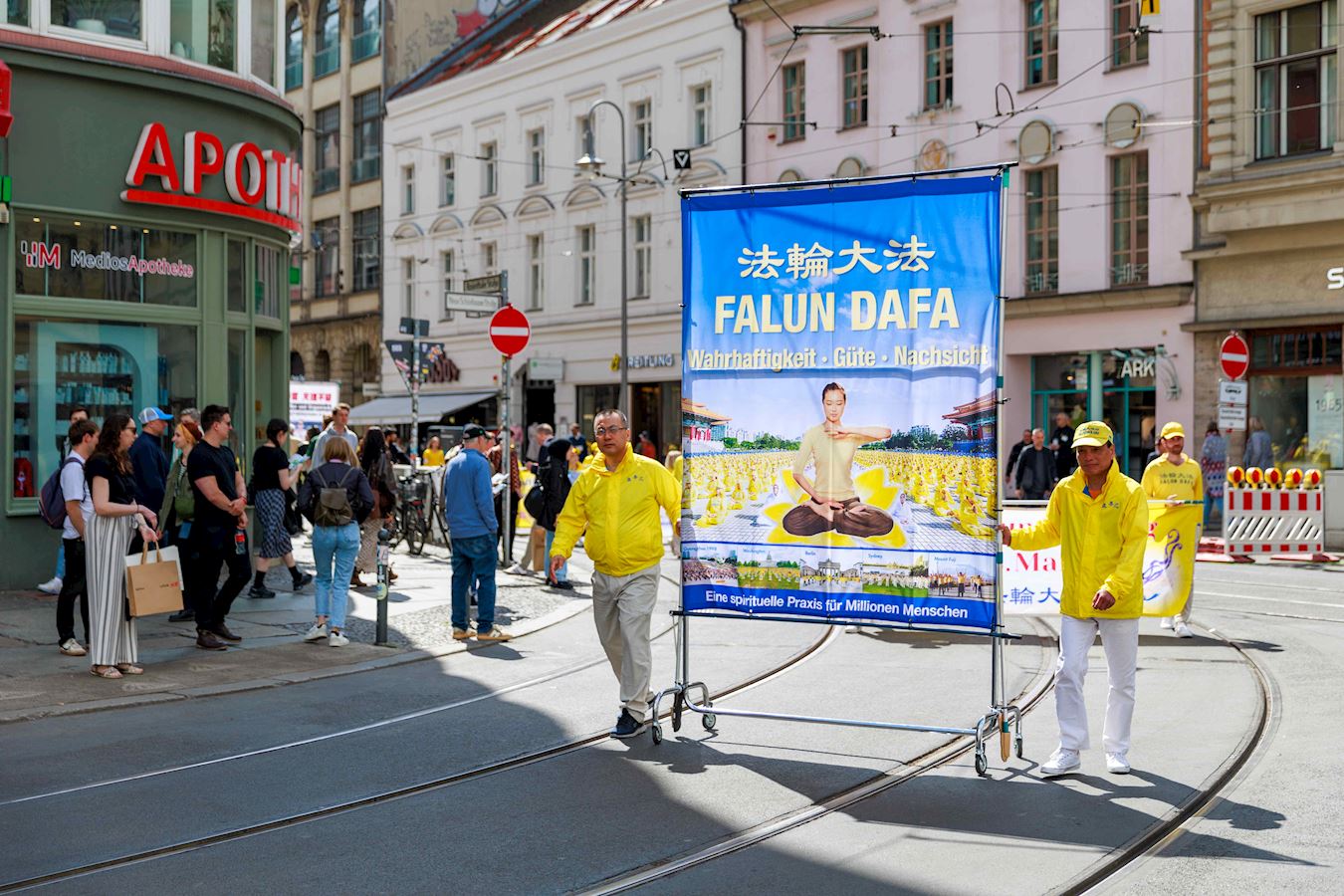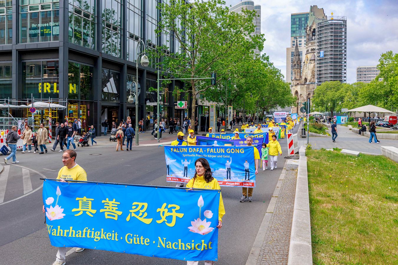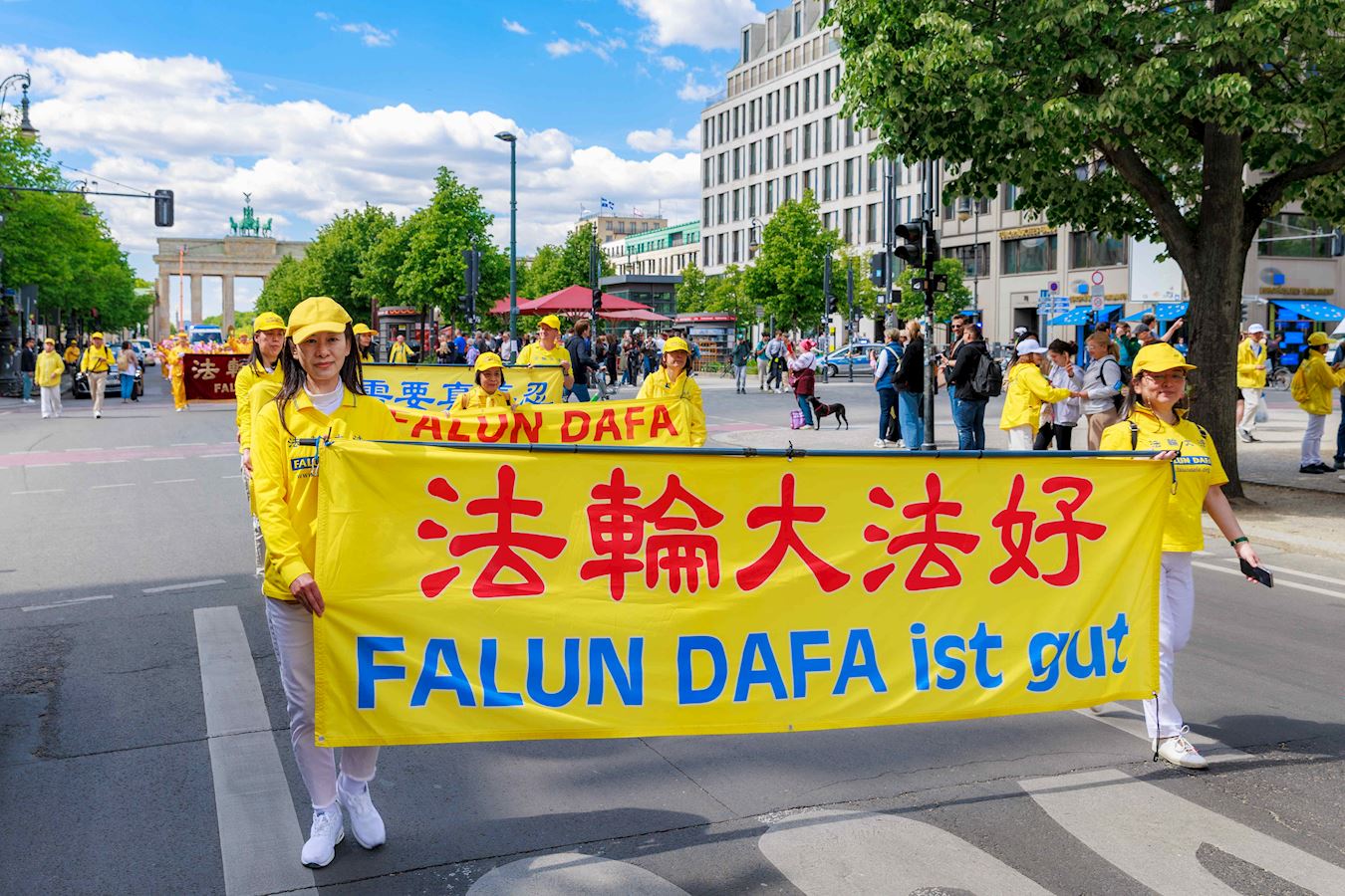 二零二五年五月九日及十日,法轮功学员的游行队伍在布莱登堡门前的菩提树下大街(Unter den Linden),被誉为柏林两大购物街的库达姆大街(Kurfürstendamm)和施洛斯大街(Schloßstrasse)等繁华街区行进,一路上由警车开道护航,确保畅行无阻。很多路人也如老妈妈一样,因此有机会听闻法轮大法,感受到真善忍的美好。他们打算要与更多人分享。