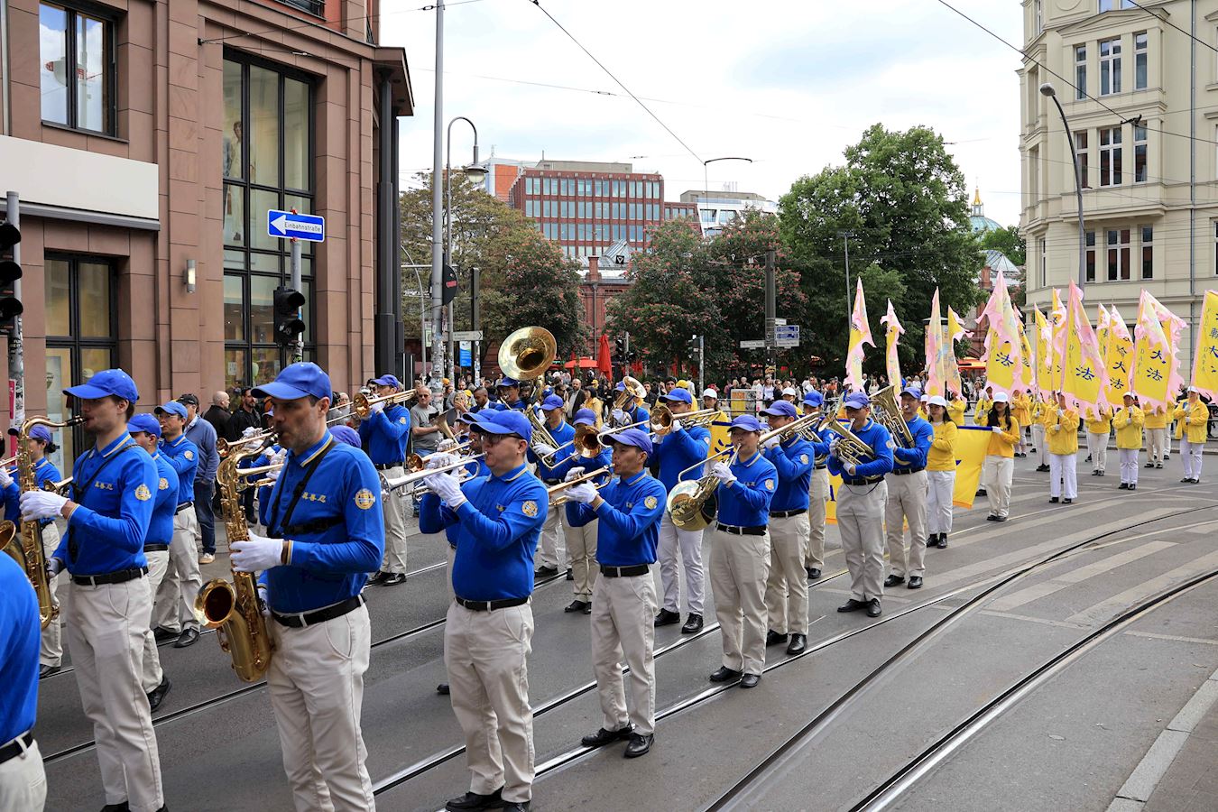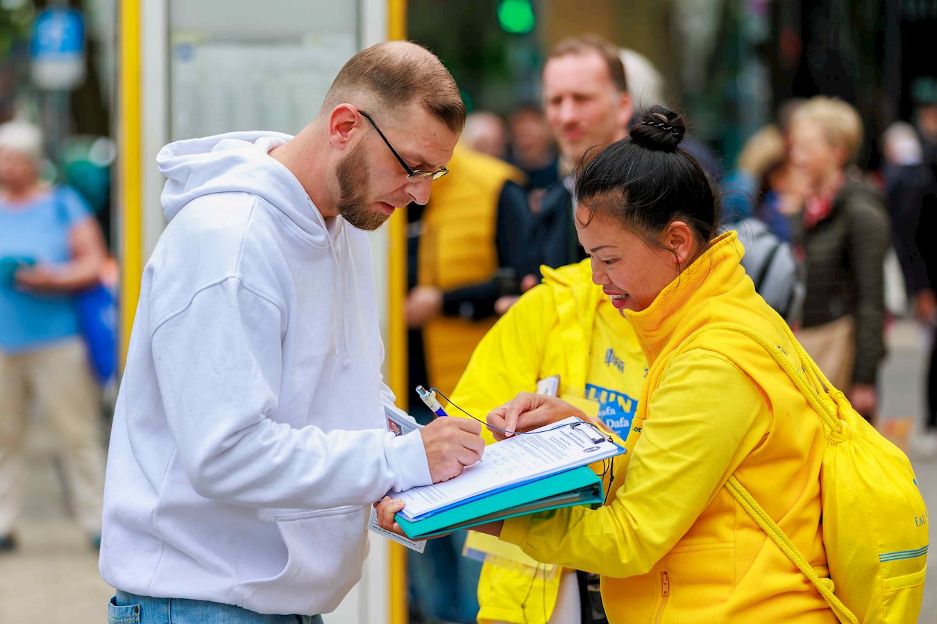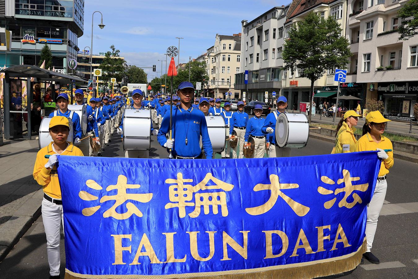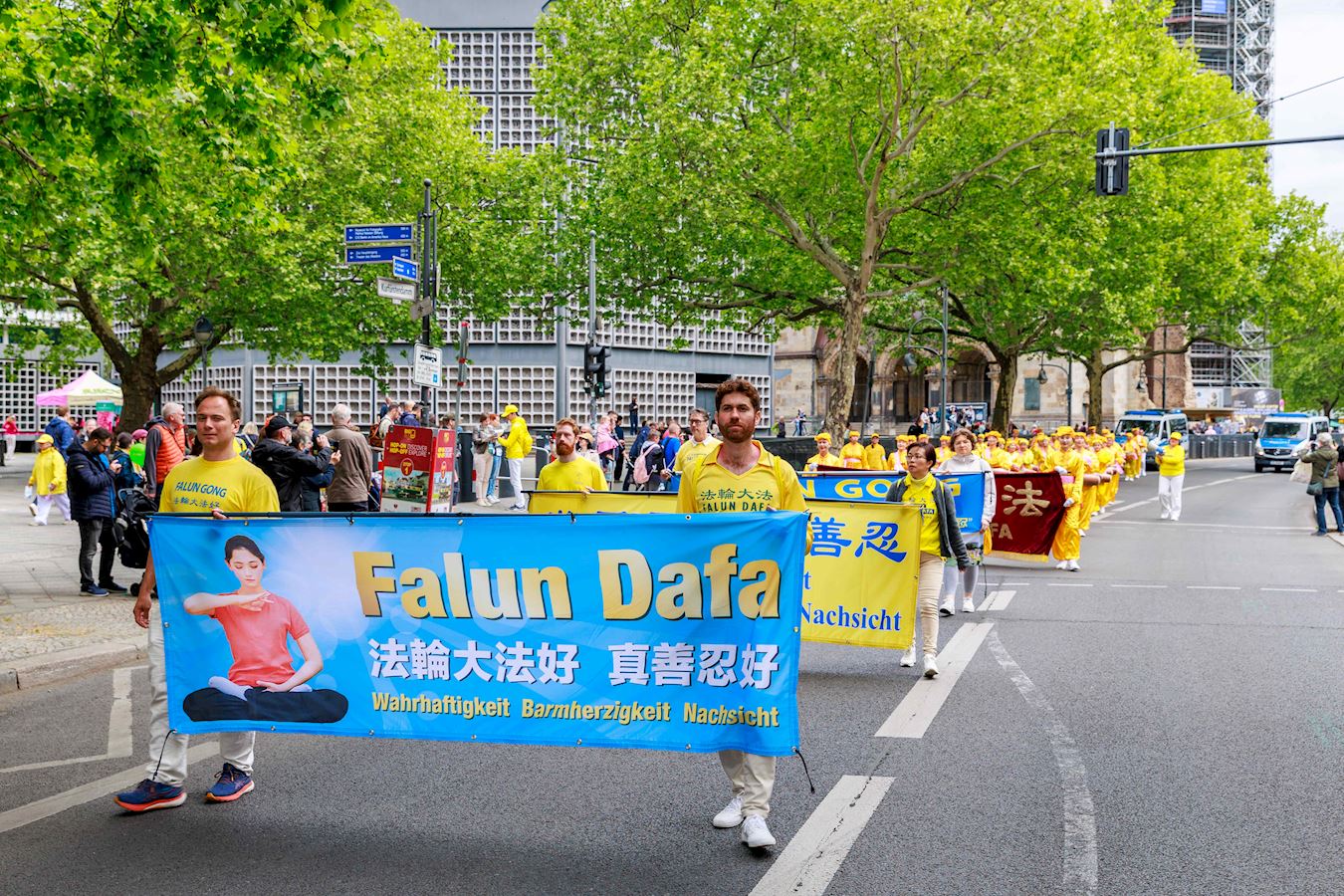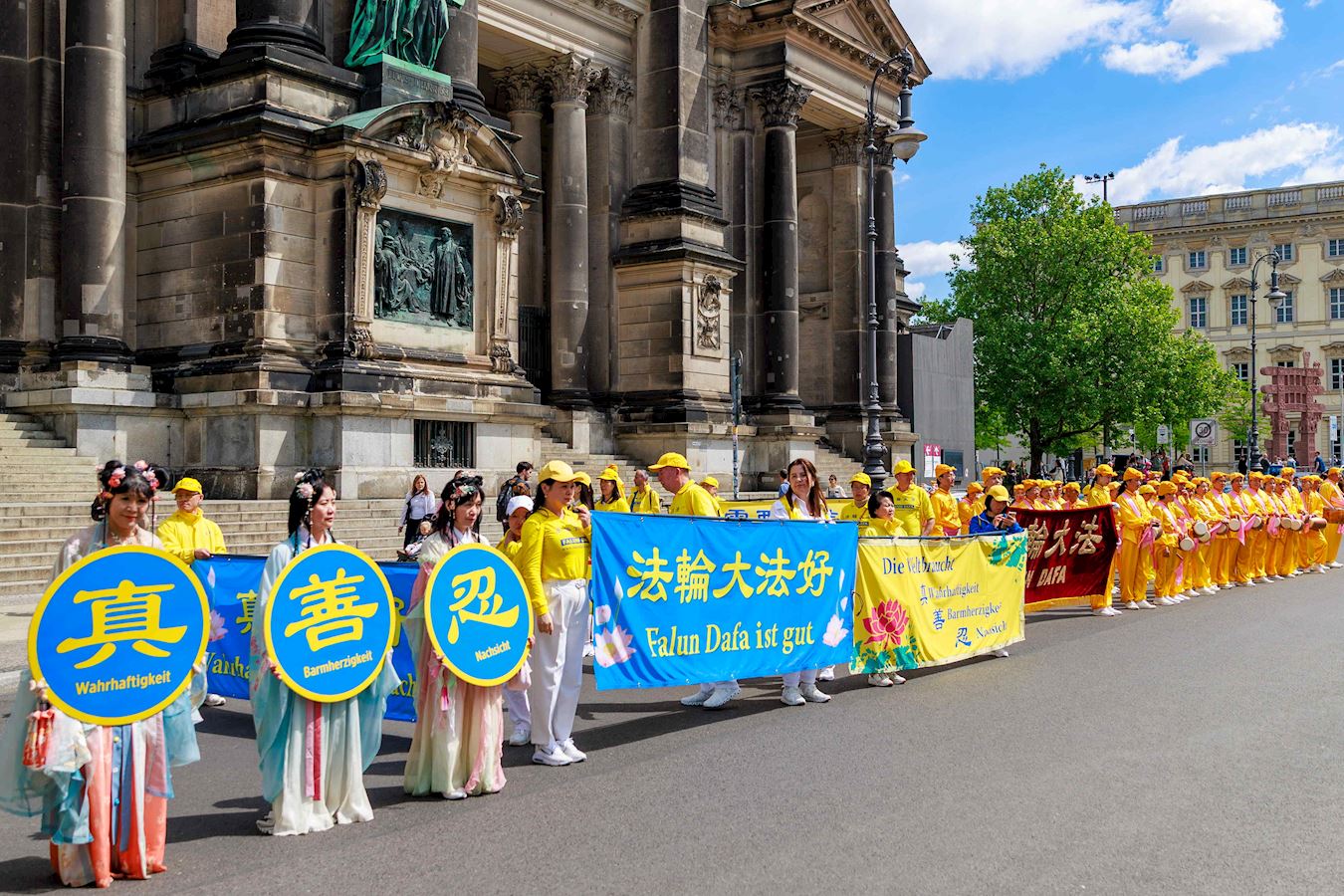 二零二五年五月九日及十日,法轮功学员的游行队伍在布莱登堡门前的菩提树下大街(Unter den Linden),被誉为柏林两大购物街的库达姆大街(Kurfürstendamm)和施洛斯大街(Schloßstrasse)等繁华街区行进,一路上由警车开道护航,确保畅行无阻。很多路人也如老妈妈一样,因此有机会听闻法轮大法,感受到真善忍的美好。他们打算要与更多人分享。