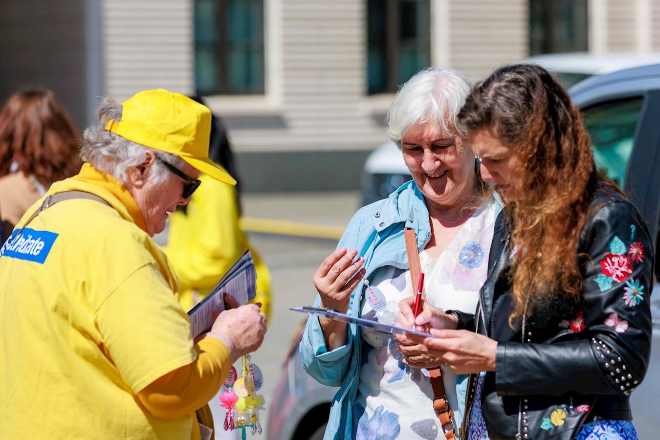 她来到队伍旁一位同样身着金黄色体恤的女士前,向她诉说自己八十高龄徒步前行的艰辛。那位法轮功学员马上表示因为大型活动带来的不便感到抱歉,随后拉着老人一起聊起来,并微笑着和她说:“也许正是这样我们才能相遇呀,让我送您一朵小莲花。外界或许动荡混乱,世事难料,但我们依然可以去修自己的内心,获得身心健康,就如这莲花般出淤泥而不染。而这也是三十三年来法轮功学员一直在实践的。”