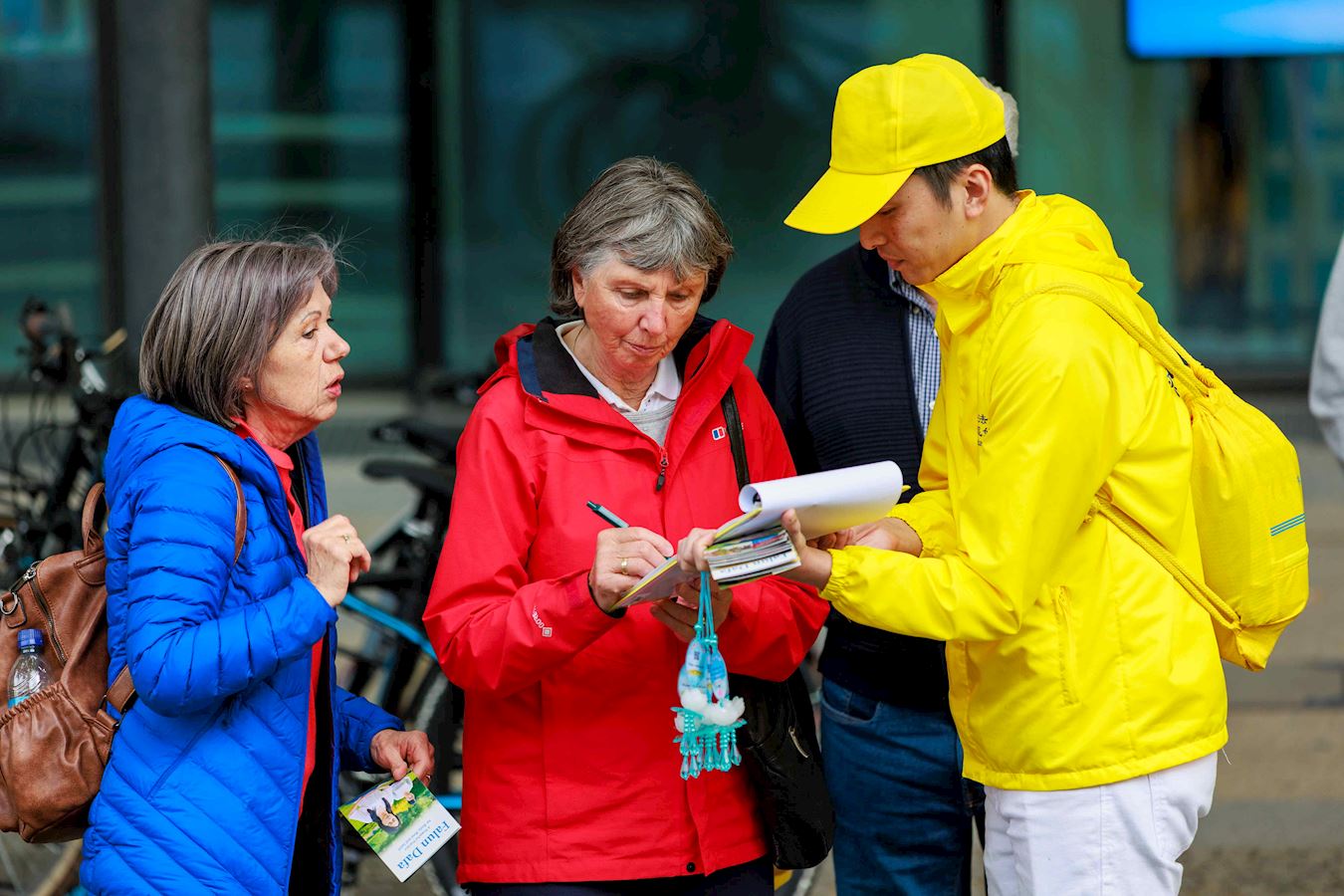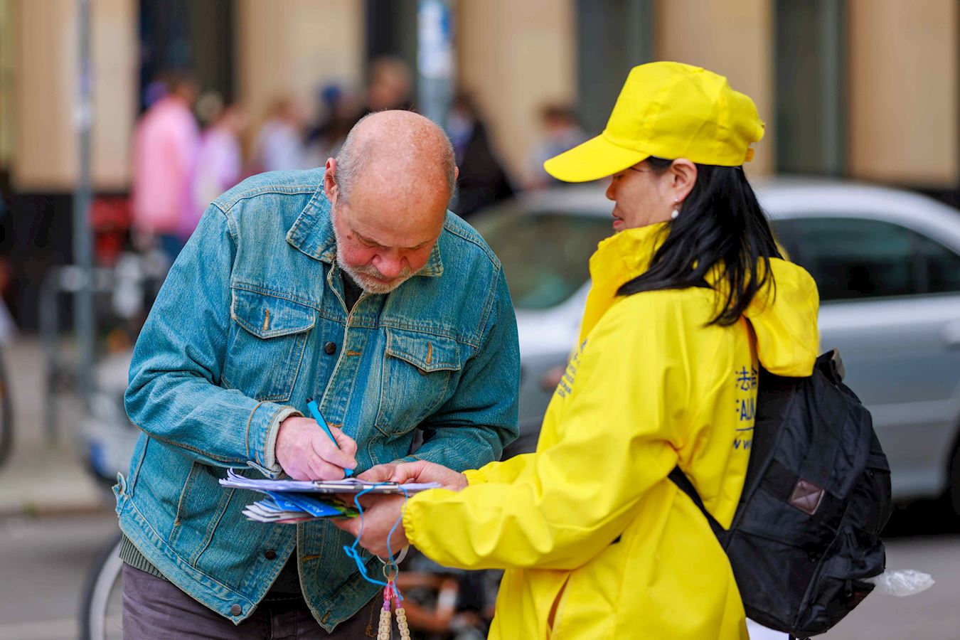 她还告诉老妈妈,当天的游行是为了庆祝世界法轮大法日,来自德国和欧洲的法轮功学员想与大家分享修炼大法,遵循真、善、忍去生活的美好。老人颇为赞同要善待他人,谈着听着,老人脸上绽开发自内心的笑容。她真诚的看着那位学员,连声说:“谢谢,谢谢!你们做的真好,太应该了!”