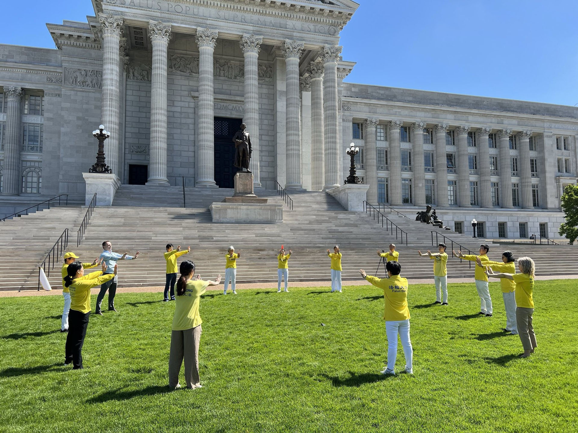 在招待会期间,部份参加庆祝活动的学员来到议会大厦外的南草坪,一起炼功。他们向人们展示炼功带给他们的宁静和美好。