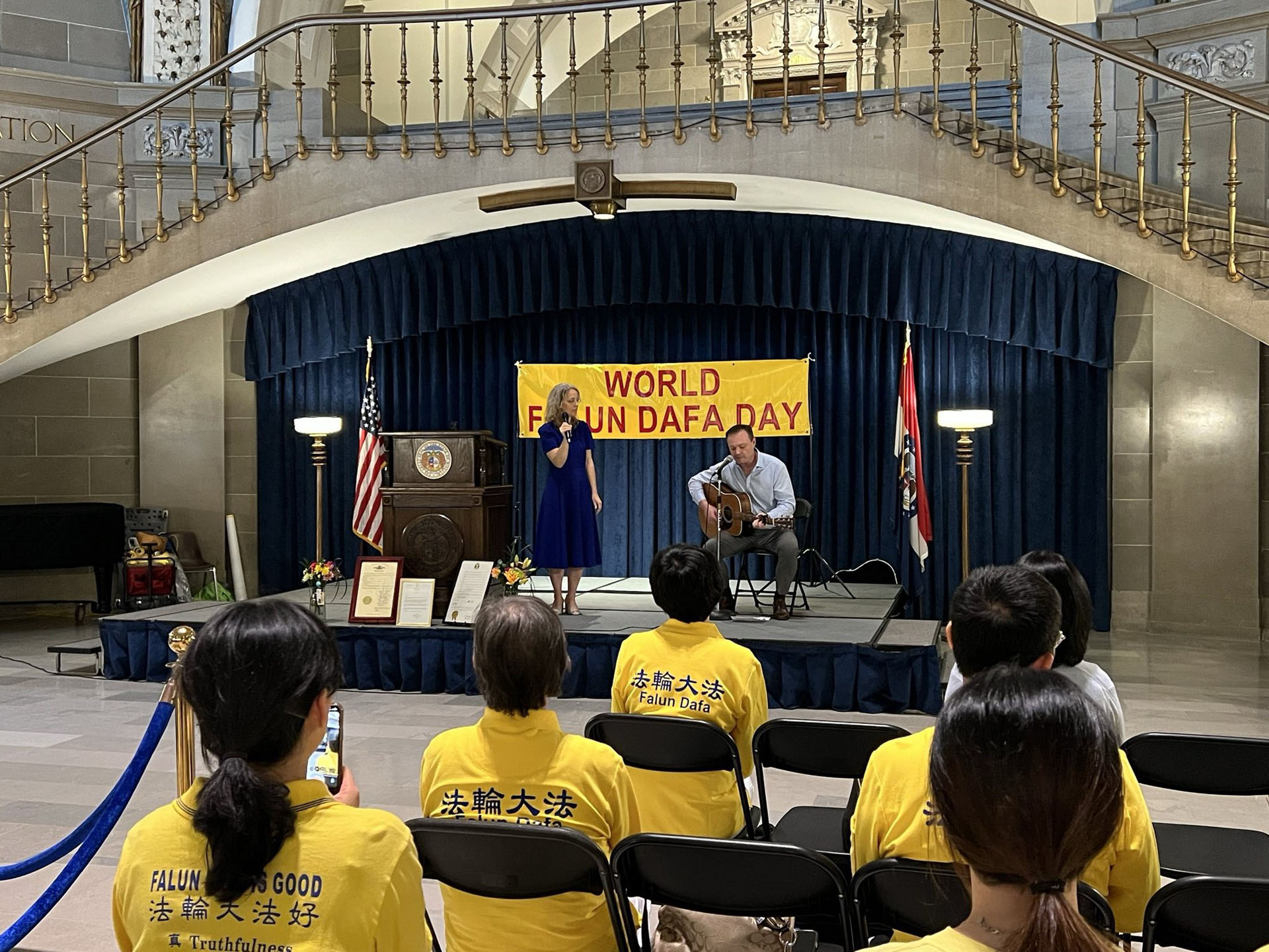 学员还和观众分享了来自州长的祝贺信。信中说,“法轮大法是一种中国传统的打坐和精神修炼方法。他超越了文化和国界,为全世界数百万人,包括密苏里州的居民,带来了身体的健康和内心的平静。他的核心价值真善忍也与我们密苏里人所珍视的价值产生了共鸣。”