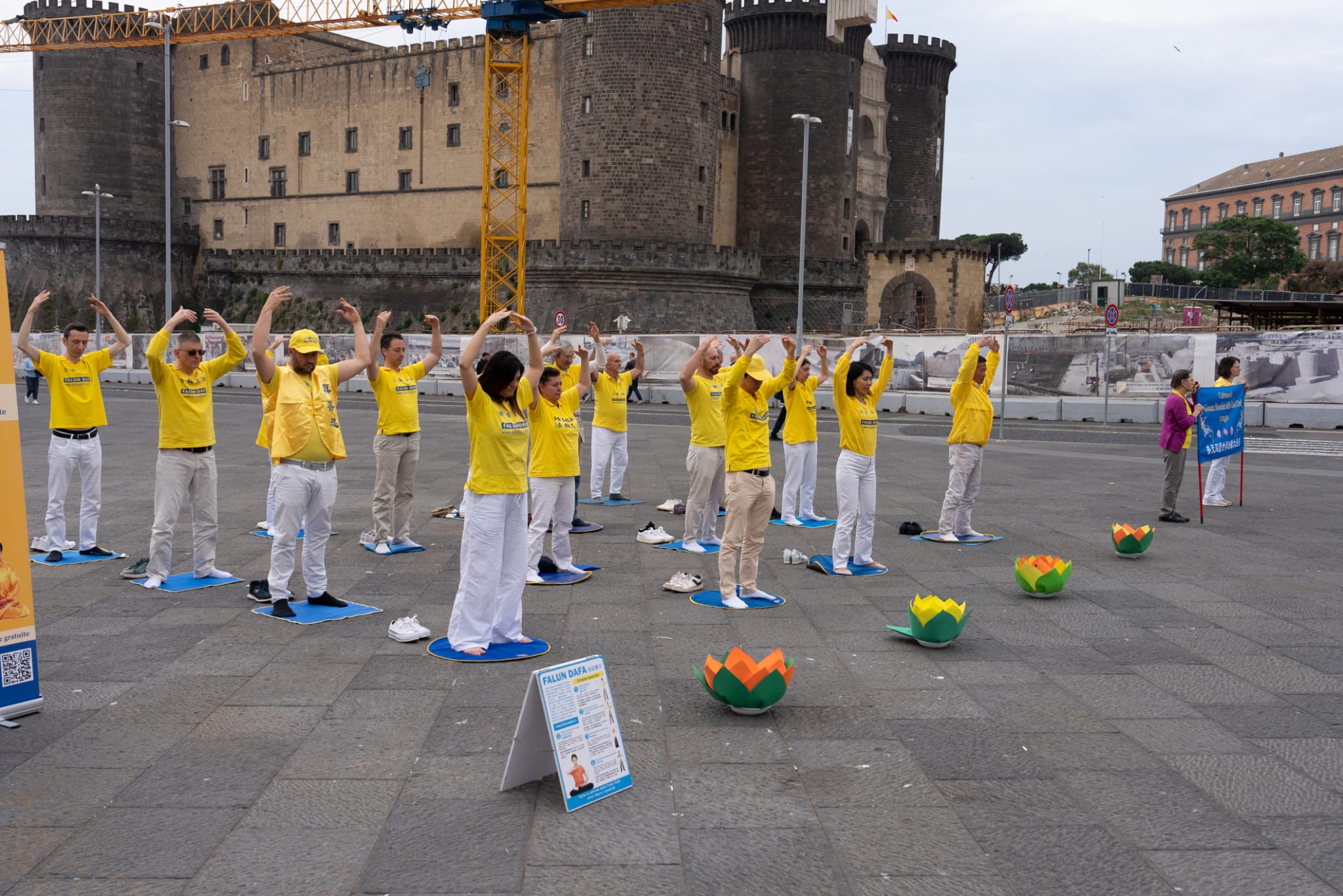 活动当天早上,法轮功学员就在广场上陈设了法轮大法弘传世界及法轮功介绍展板,学员们伴随着祥和的炼功音乐,动作舒缓的炼习法轮功功法,身着明亮黄色服装的法轮功炼功团体,给那波理市政府广场增添了一道明丽的色彩,在蔚蓝的海水及庄严的新城堡衬托下,形成了一幅美好,曼妙的新风景。