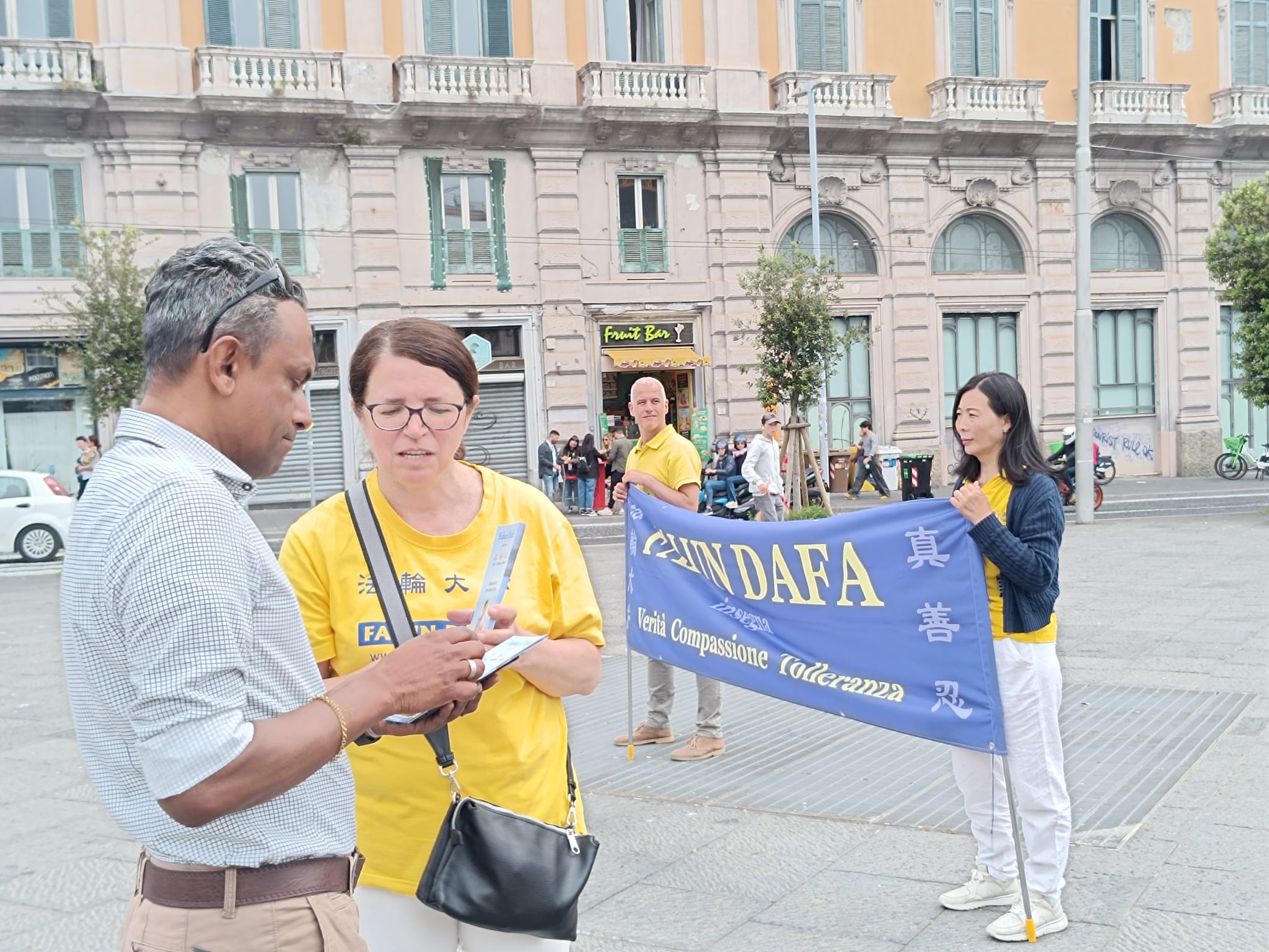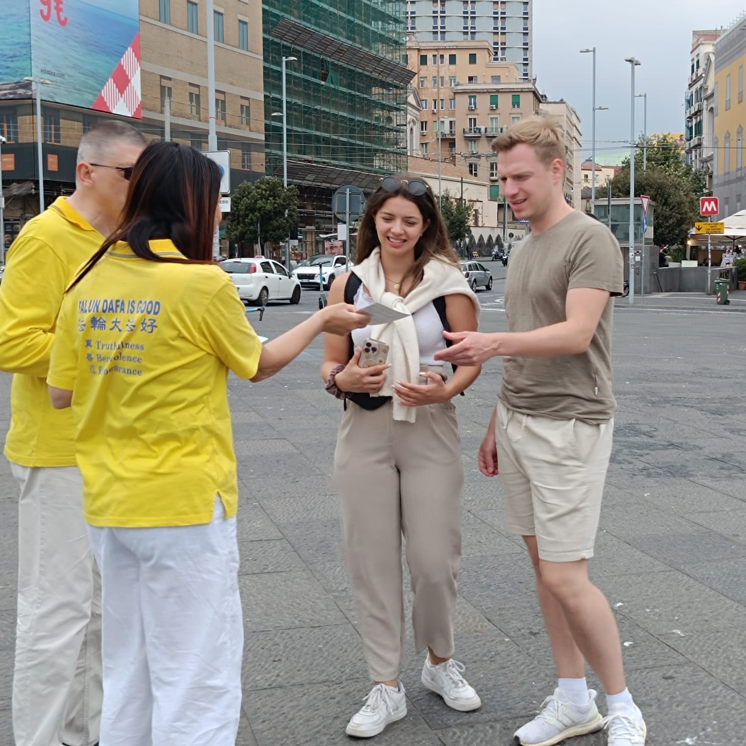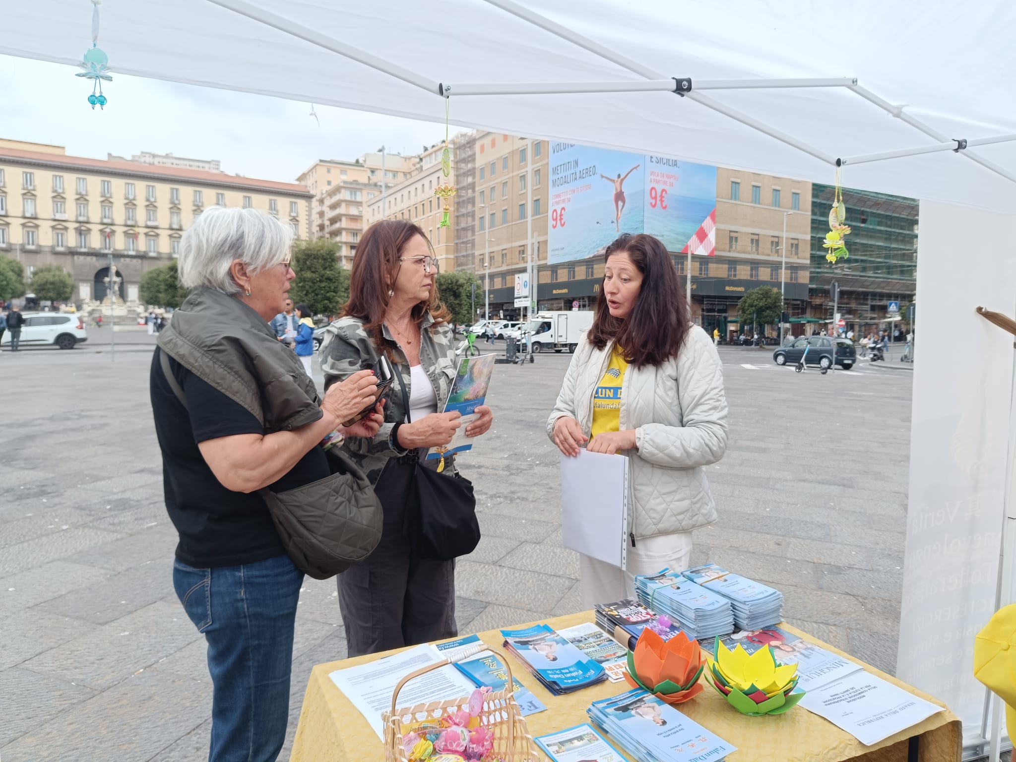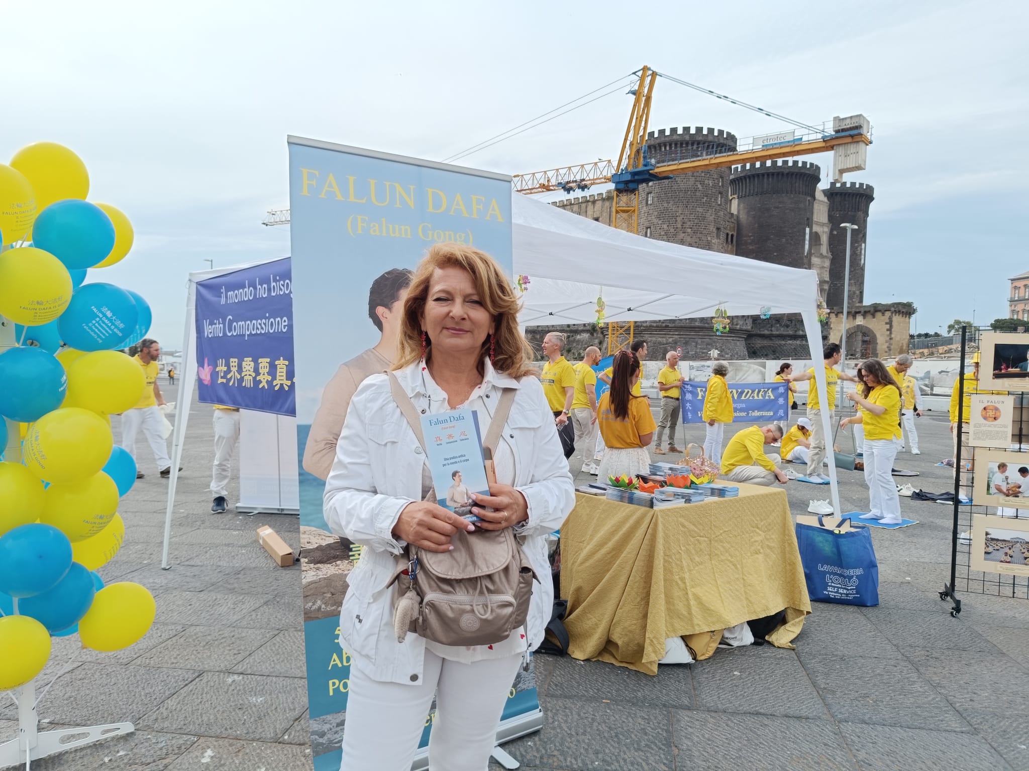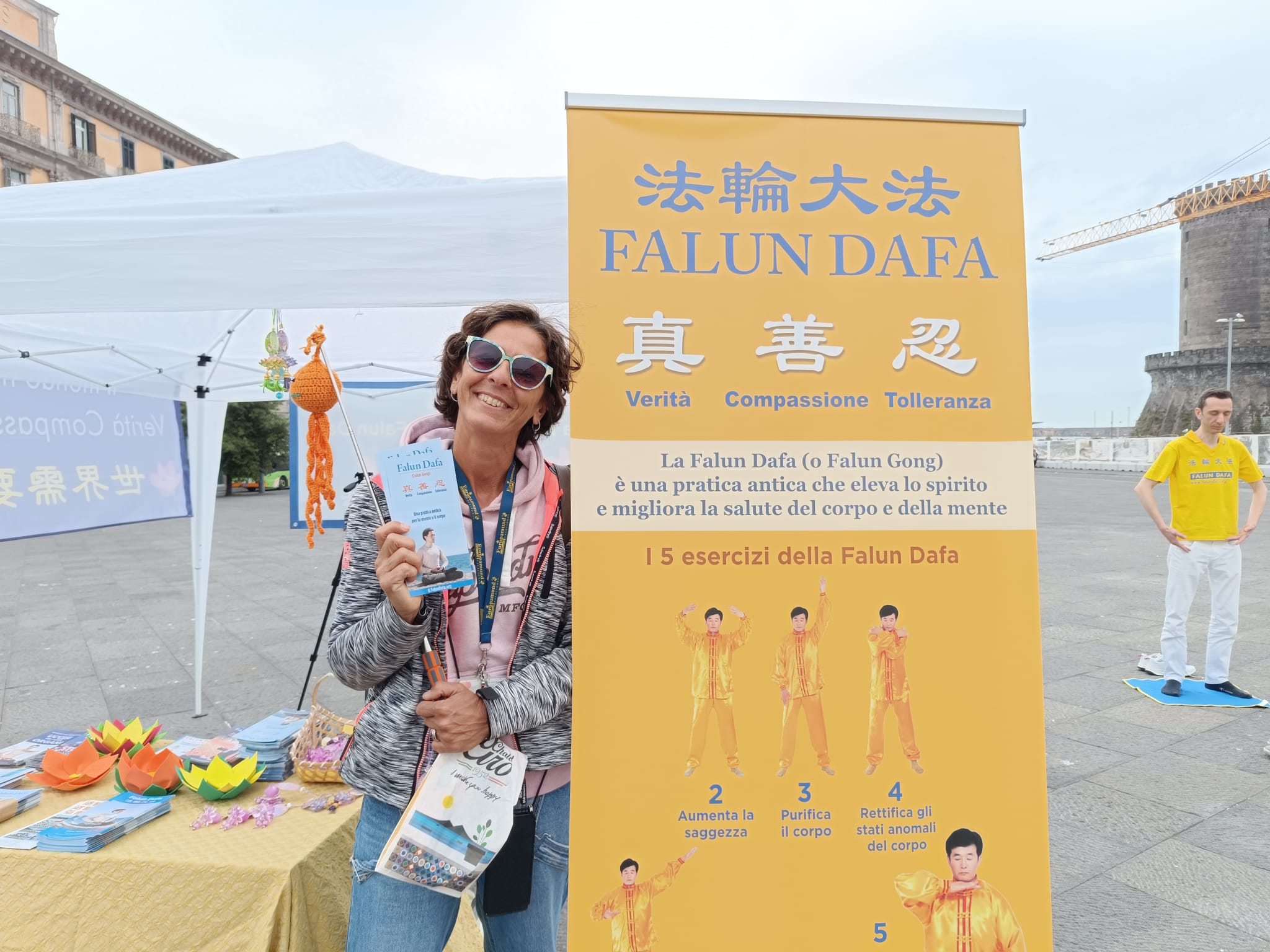 同样被吸引来到法轮功活动现场的安娜·朱都(Anna Giunto) 女士也是一位导游,她看到祥和优美的炼功动作,觉得内心被深深触动,觉得太美好了,在与学员交谈后表示:“我们正在失去很多重要的维持人类道德的宝贵价值,如果人们能遵循真、善、忍人类就不会是今天这样的相处状况,会真正的和平相处。”并表示要不是自己工作在身,她真想停下来学炼功法,最后她表示非常支持法轮功学员以这种和平,坚毅的形式坚持自己的信仰!