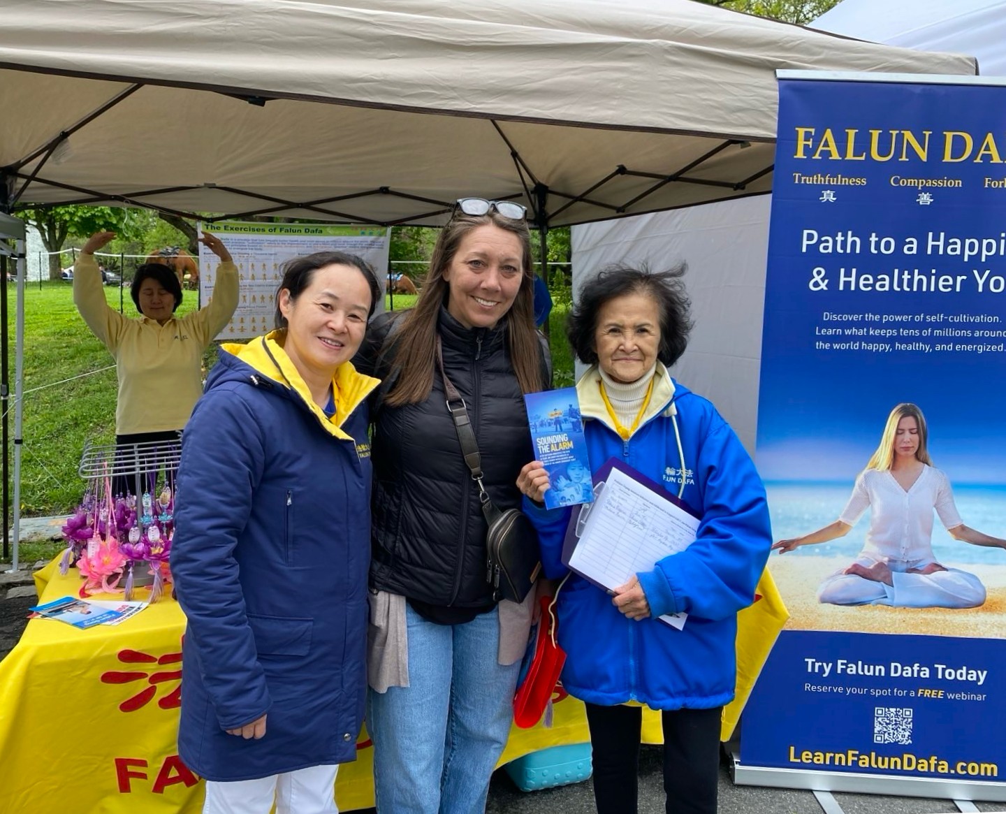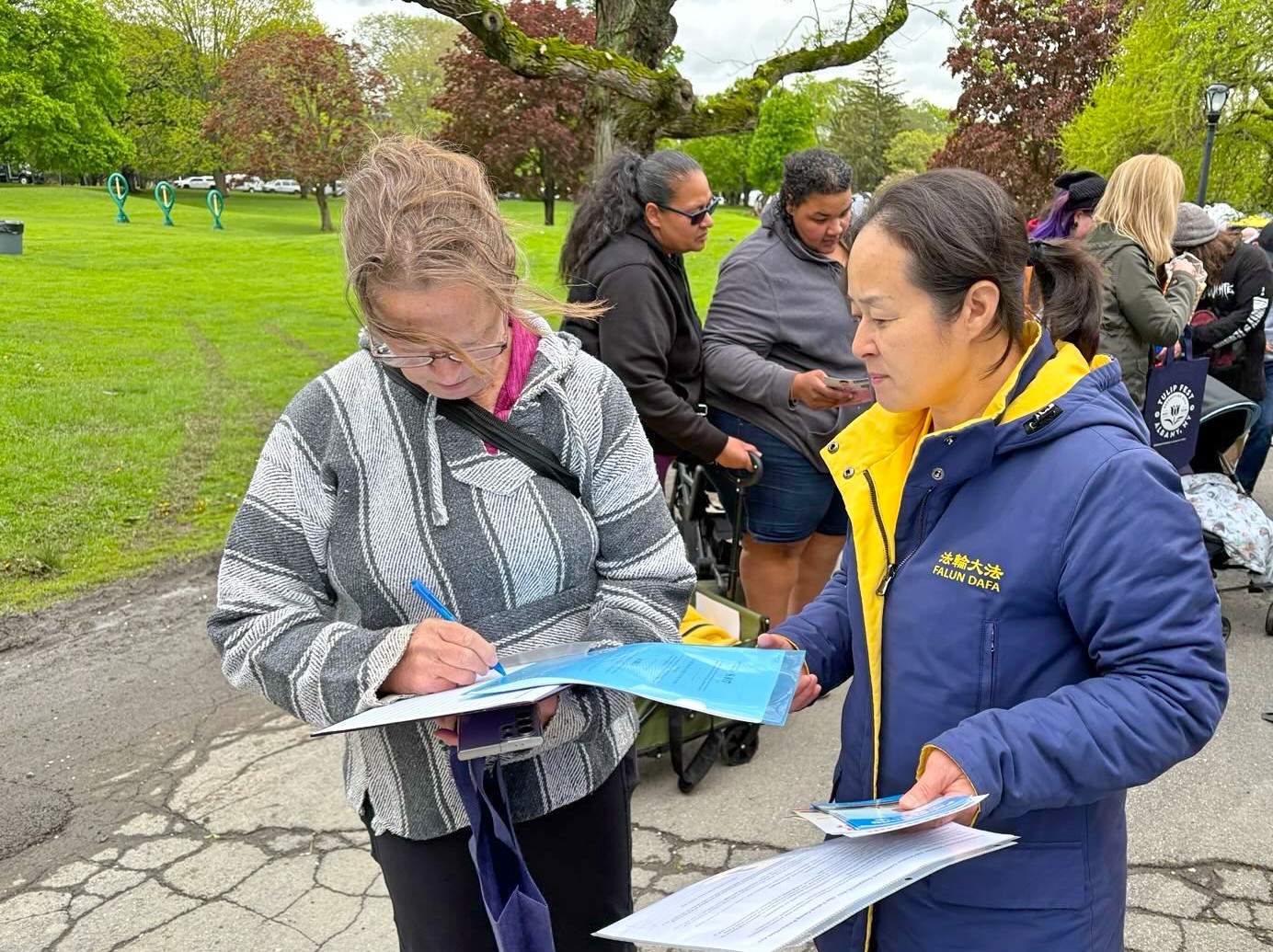 有些人表示希望学习功法,并认真记下了炼功点的信息。当他们得知法轮功在中国正遭受残酷迫害时,立即在支持《法轮功保护法案》的请愿书上签名。签名后,他们真诚地感谢学员向他们讲述了中共迫害法轮功的真相。