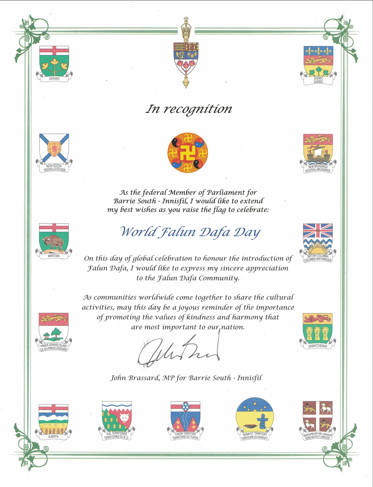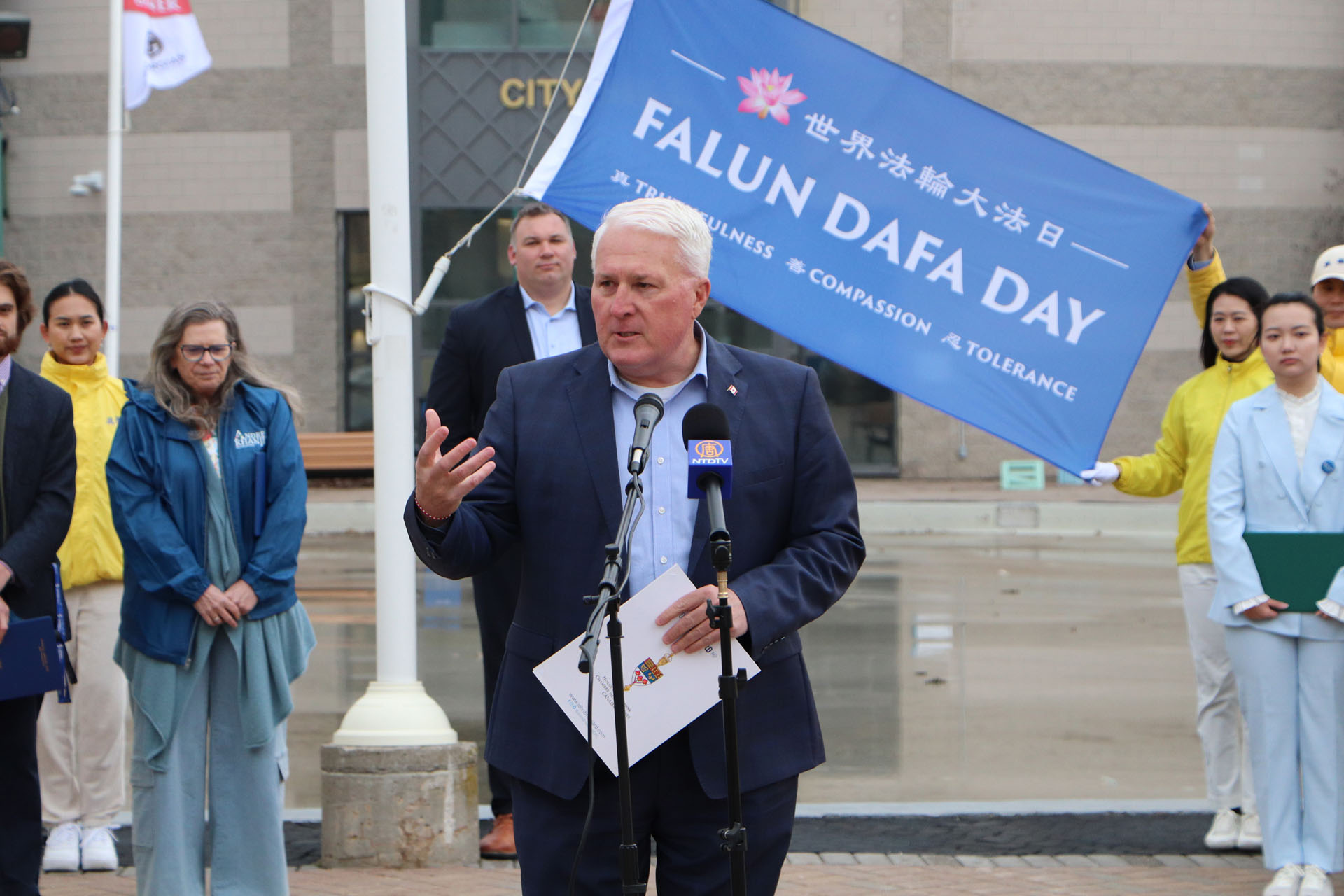 巴里南—伊尼斯菲尔选区的联邦国会议员约翰·布拉萨德(John Brassard)再一次参与了祝贺法轮大法日的升旗仪式,他在发言中说:“我听到了天上的响雷,就象天上的鼓声在为法轮大法鸣响。我预料到可能很快会下雨,但,法轮大法好,法轮大法好!”