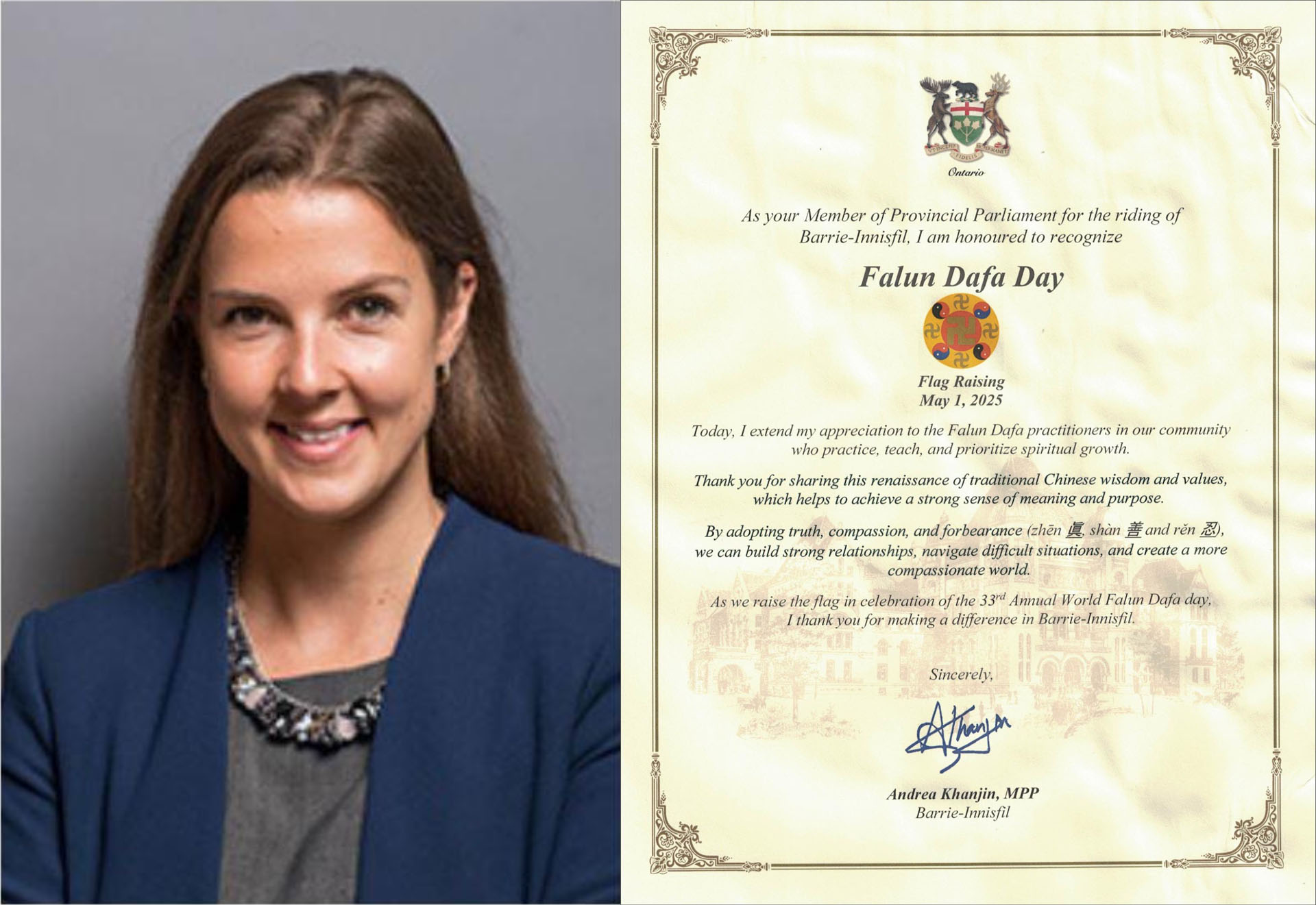 省议会议员安德烈·汉金(Andrea Khanjin)在贺信中表达了对法轮功学员的感谢,并提到:法轮功学员分享和复兴传统中华智慧和价值观,帮助人们获得深刻的意义感与人生目标。