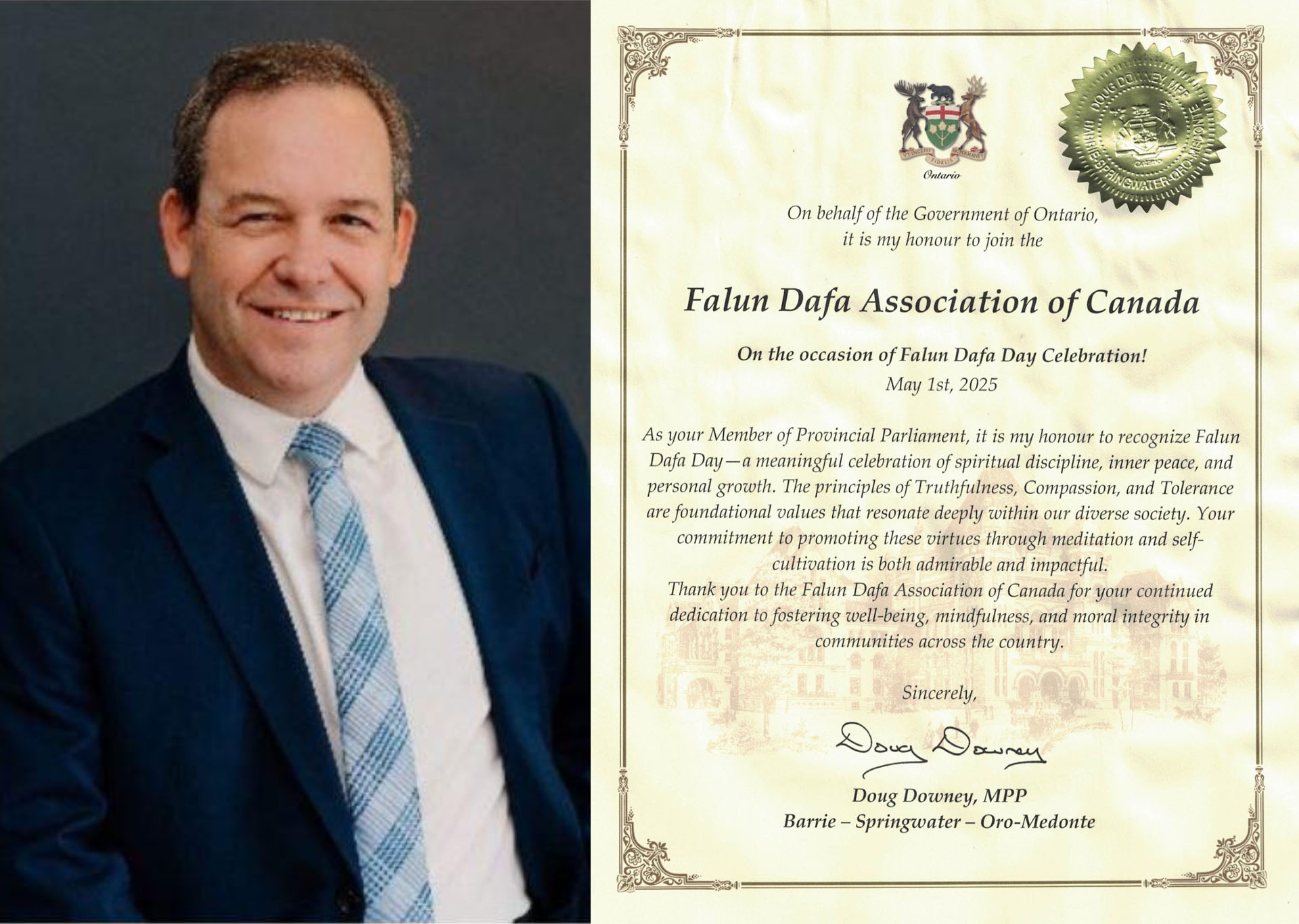 省议会议员兼安省司法部长道格·唐尼(Doug Downey)在贺信中提到,法轮大法日的庆典对精神修养、内心安宁、个人成长具有意义。
