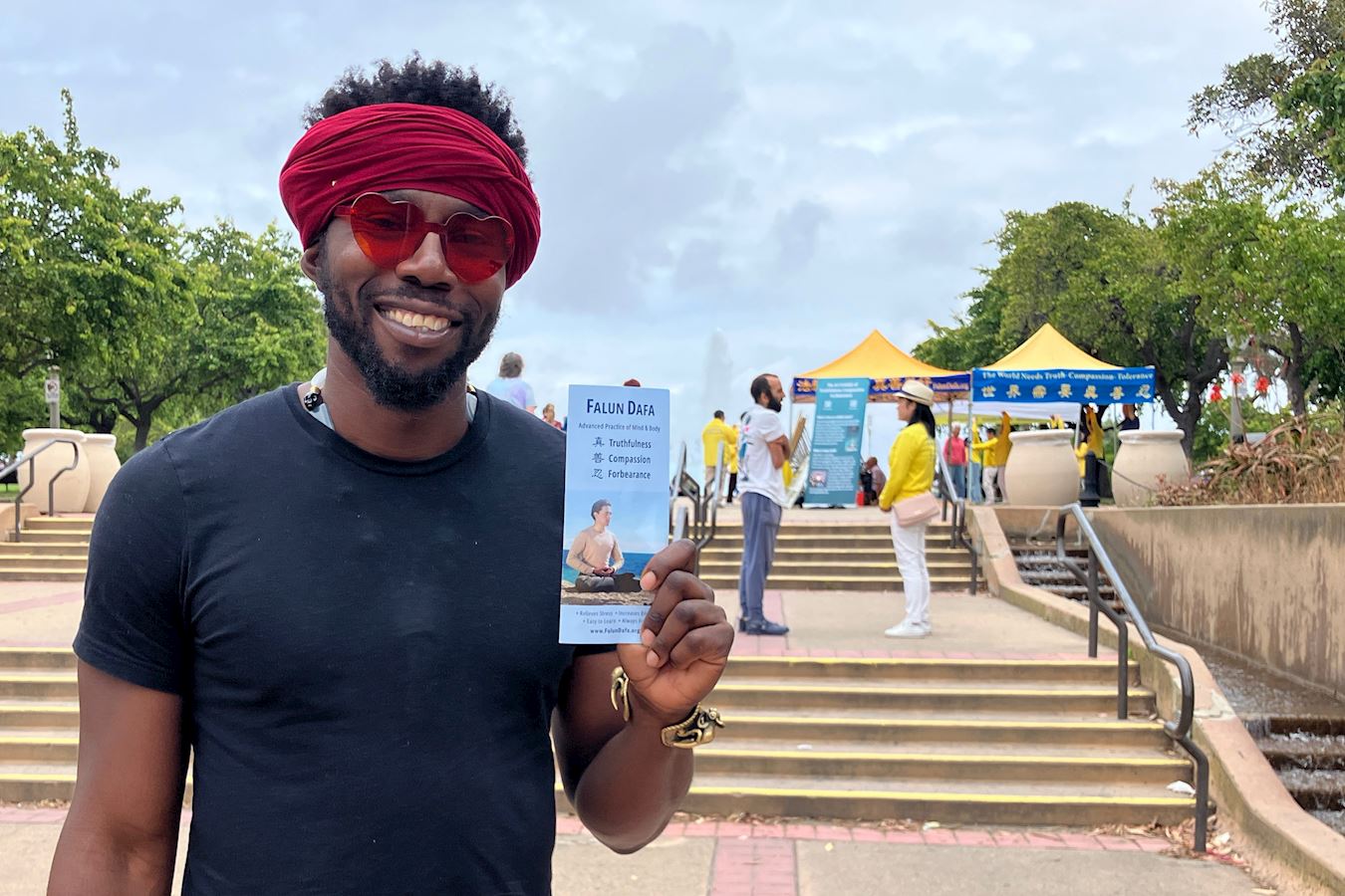 “我看着那些动作有点象法轮大法,当我走得更近时,发现确实是法轮大法。”歌手拉肖恩(Rashaun)说,“我必须分享,让大家知道法轮大法真的改变了我的生活。”