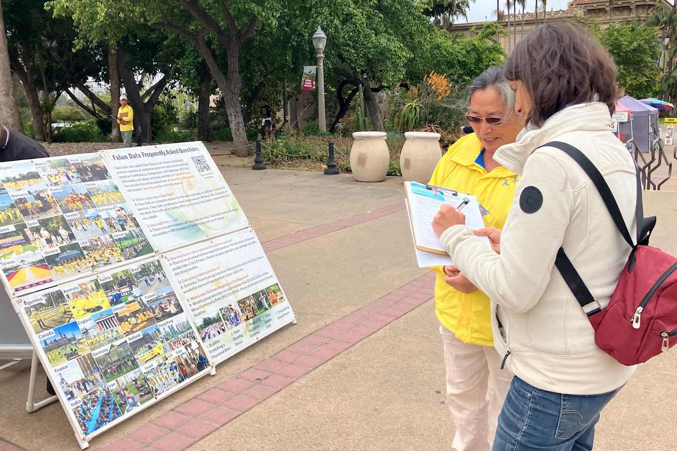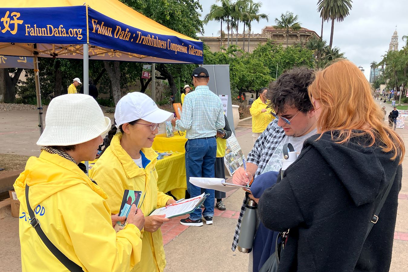 ![]() 图1:二零二五年五月十七,加州圣地亚哥法轮功学员在当地著名景点巴博亚公园再次举办真善忍画展,并为美国参议院发起的《法轮功保护案》征签。 |