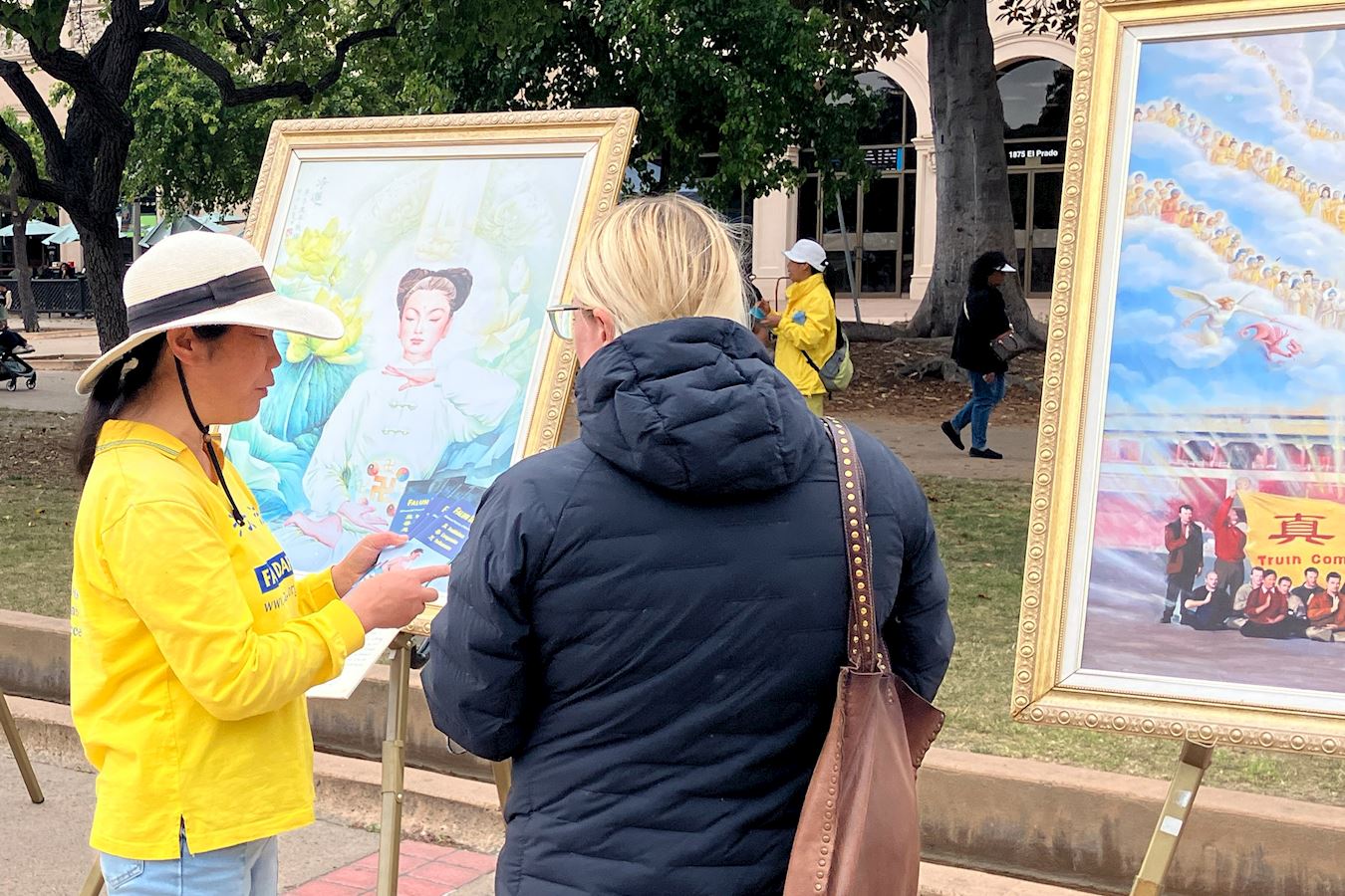 来自新泽西州的游客露安·朗斯维尔(LouAnn Rounseville)在画展前驻足。她说,这是她第一次听说法轮功,第一次了解到中共对法轮功的迫害。