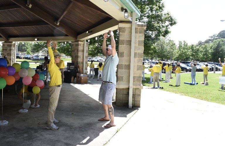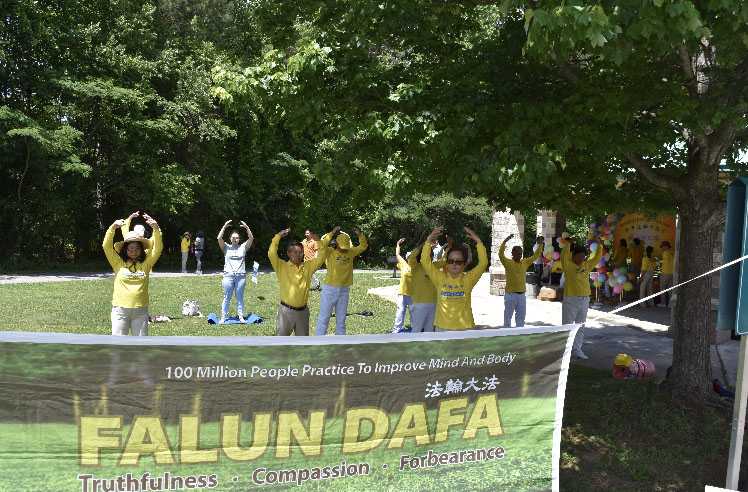 ![]() 图1:美东南法轮功学员在草坪上炼功 。 |