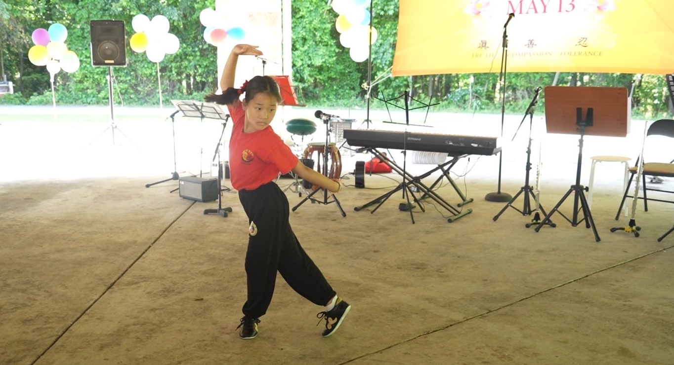 之后,所有参与活动的学员都到一个大凉亭下举行庆典活动。首先由三位学员以中文、英文和越南文朗诵庆典的开幕词。接着,几位大法小弟子演示了法轮功的炼功功法,然后他们用中文及英文背诵数首《洪吟》。一位大法小弟子还给观众带来了武术表演。