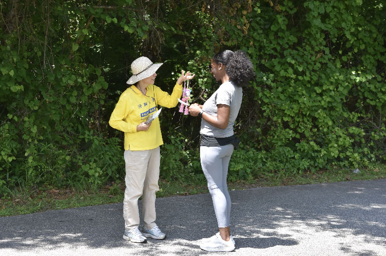 活动一开始,有的学员在公园的草坪上炼五套功法,也有学员向在公园休闲的民众介绍大法以及教炼功。