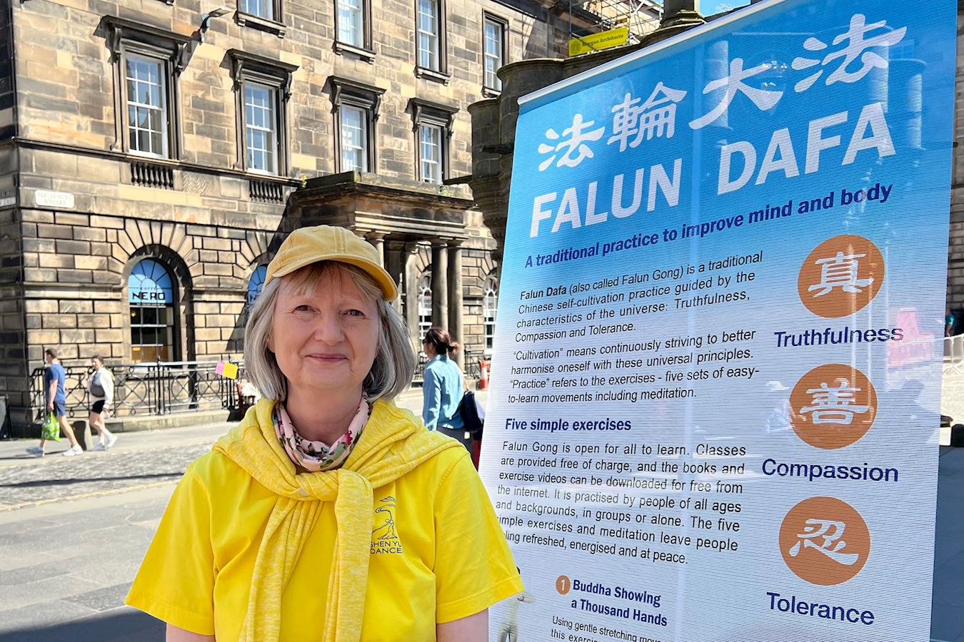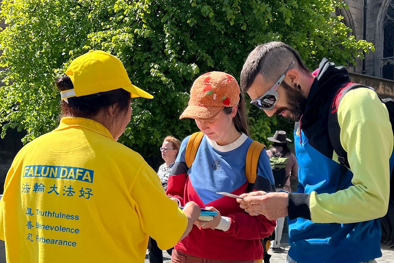 二零二五年五月十七日,为庆祝第二十六届世界法轮大法日,苏格兰及北英格兰的部分法轮功学员相聚苏格兰首府爱丁堡,在著名的王家一英里大街举办活动,向民众介绍法轮大法弘传世界三十三周年、为世界各民族上亿修炼者带来福祉的盛况,并恭祝法轮功创始人李洪志师父生日快乐。
