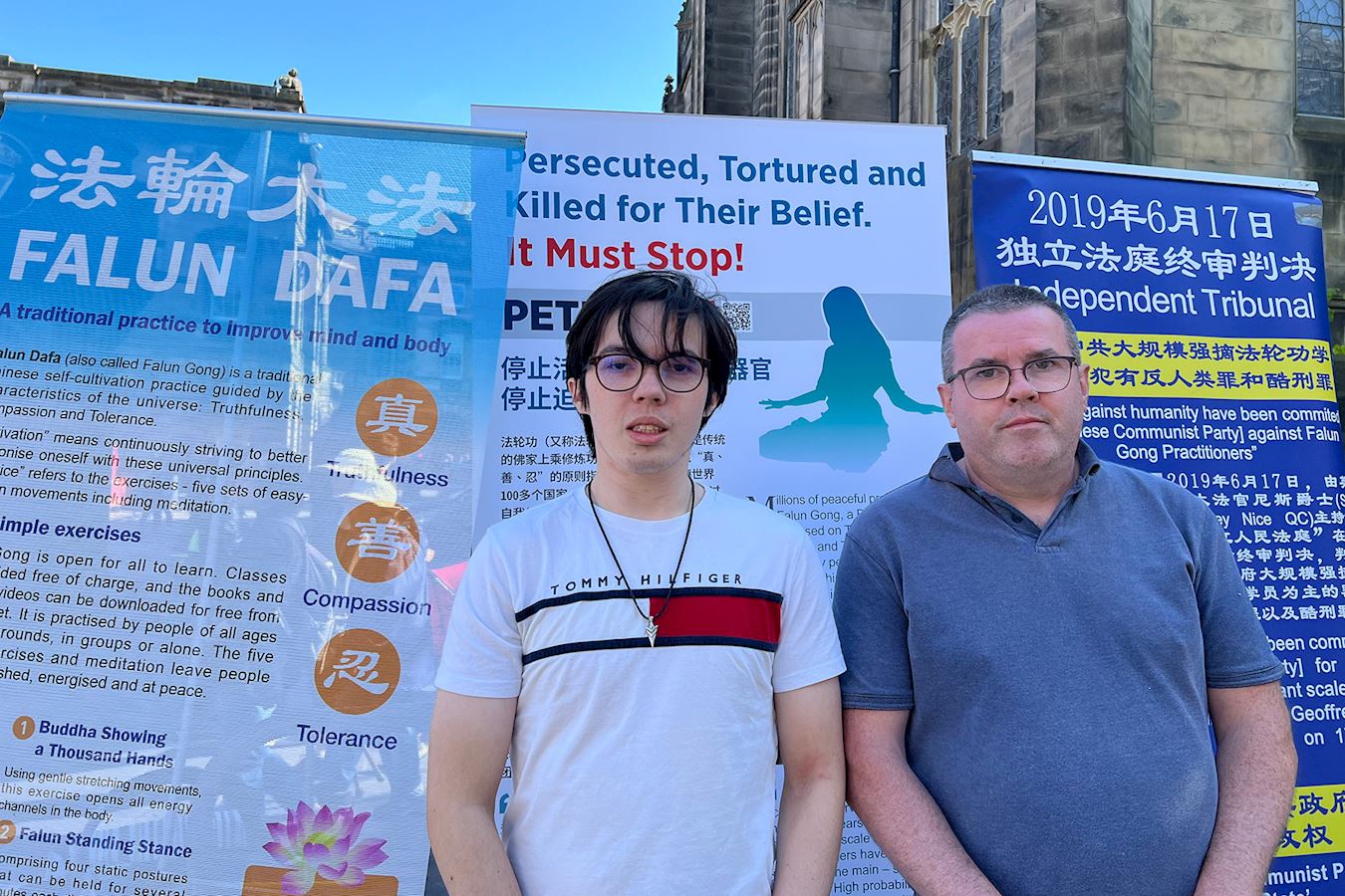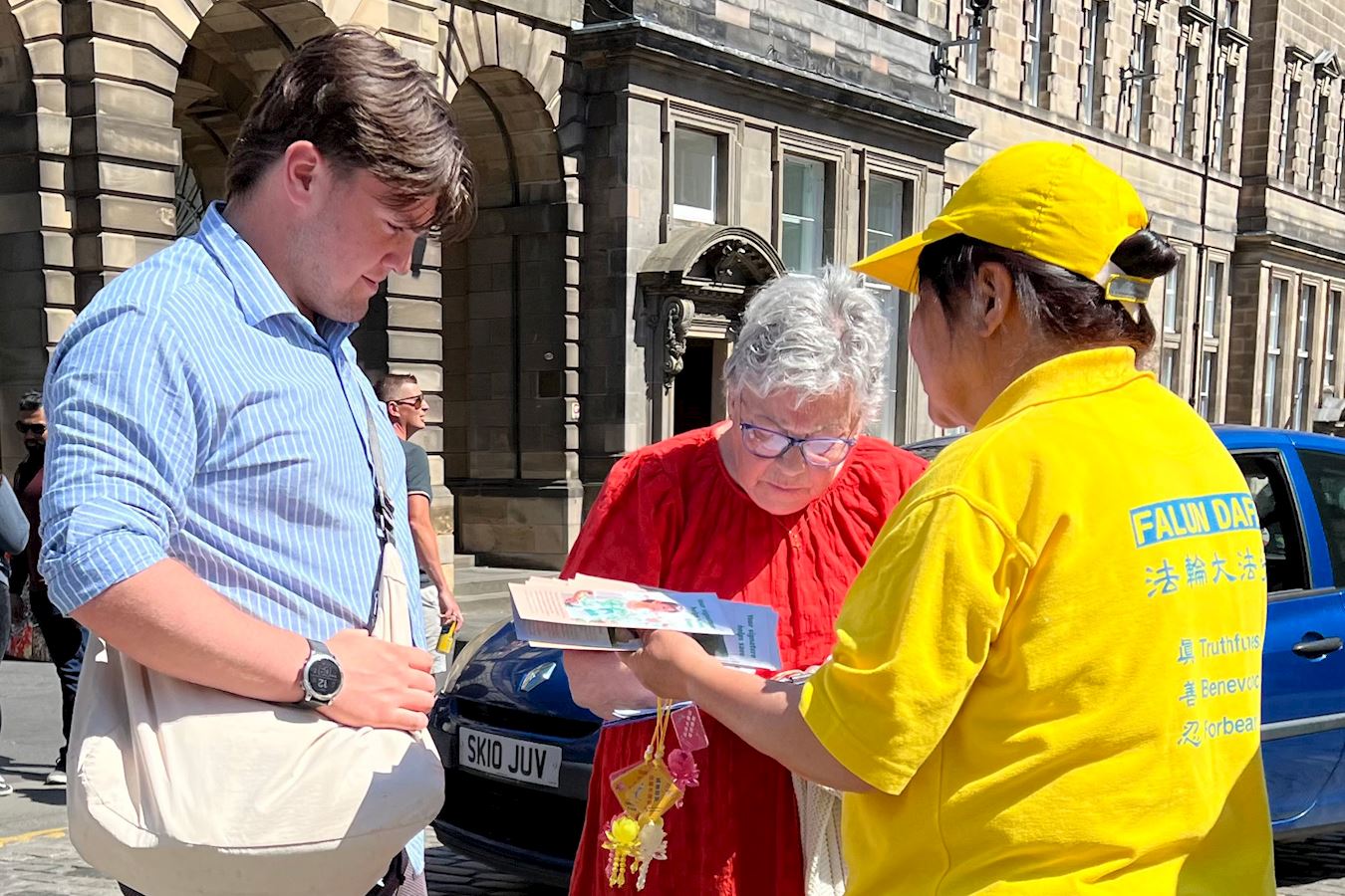 一位二十多岁、肤色黝黑、带着美国口音的男青年,拿着法轮功简介传单,询问当地义务教功班的地点和联系方式。他说:“我会和住在爱丁堡的父亲一起去学功。”