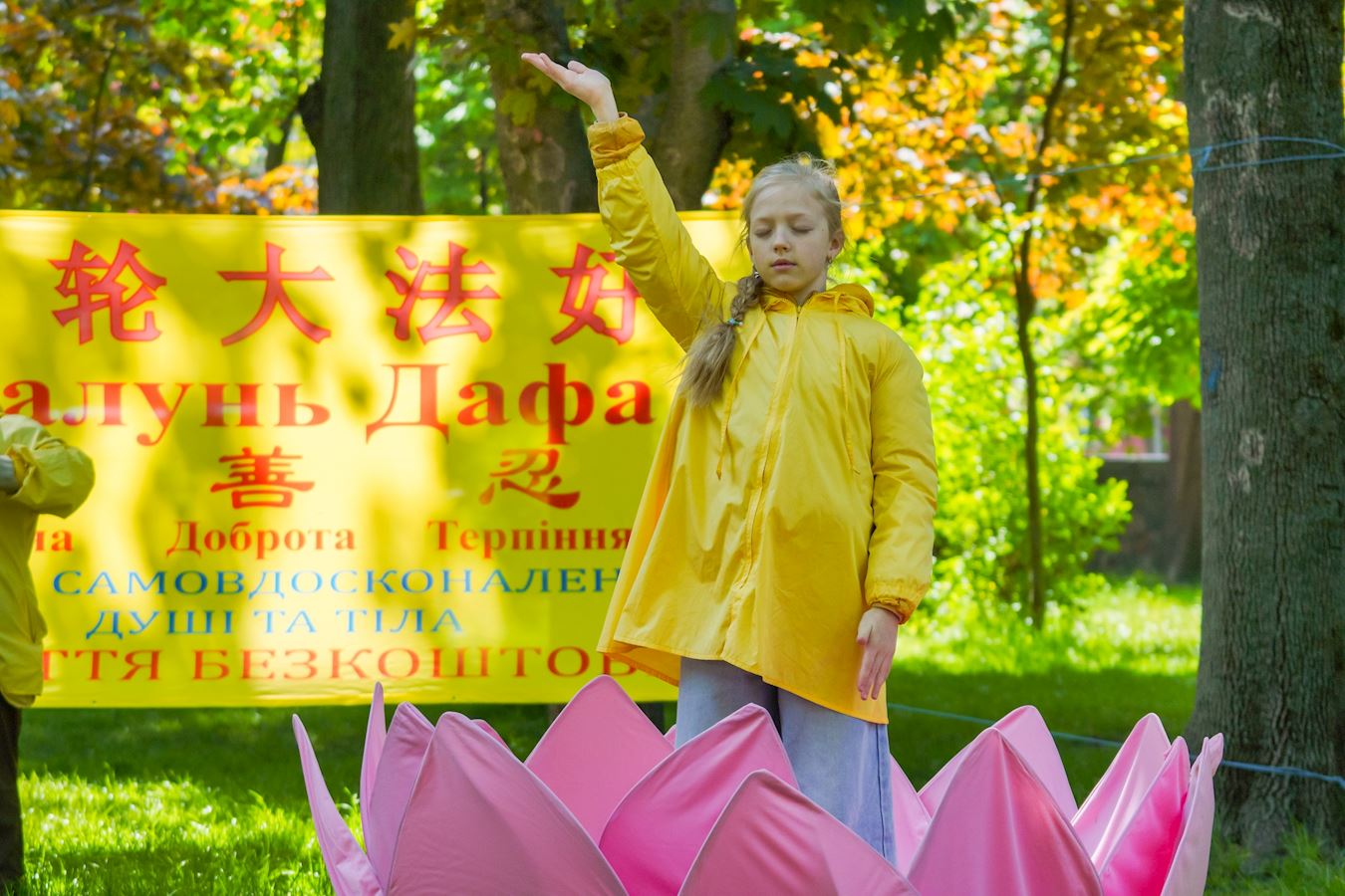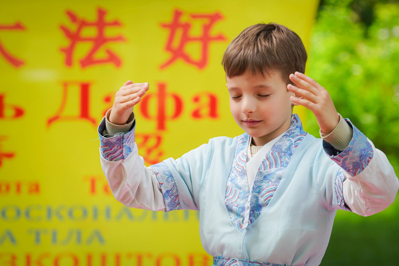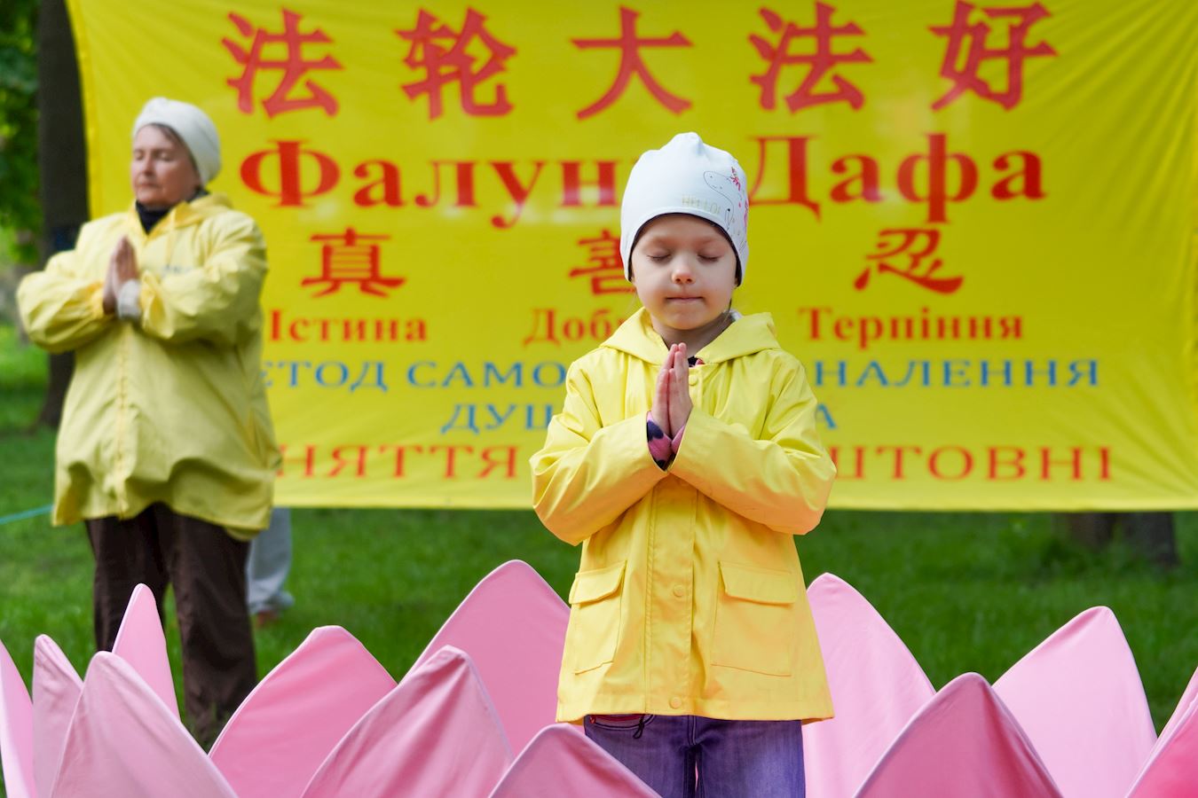 孩子们也在炼功,九岁的米罗斯拉夫(Myroslav)从小就跟随父母修炼法轮功。