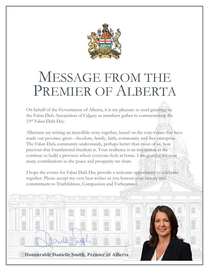 亚伯塔省省长史密斯(Danielle Smith)贺信写道:“谨代表亚省政府,向法轮大法学会致以诚挚的问候。”
