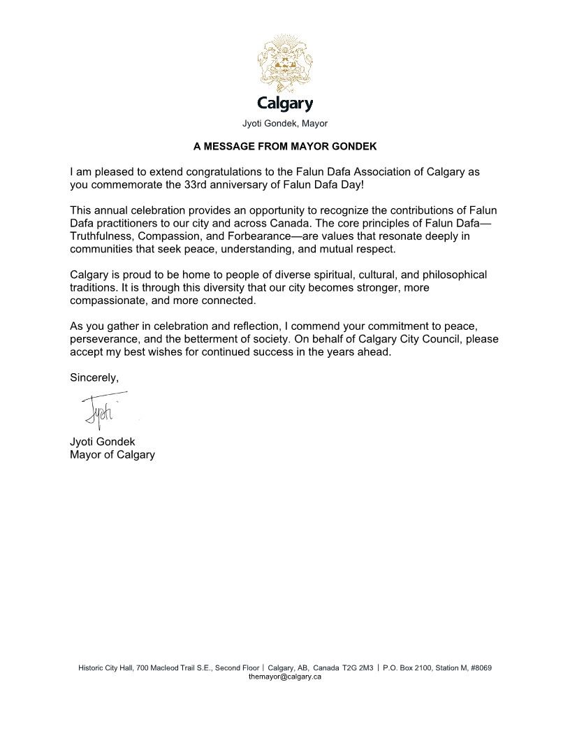 亚省最大城市卡尔加里的市长贡德克(Jyoti Gondek)的贺信表示:“谨向法轮大法学会致以热烈祝贺!”
