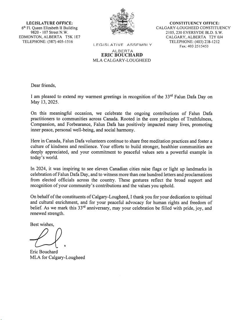 卡尔加里洛希德(Lougheed)选区省议员布沙尔(Eric Bouchard)认为法轮大法日是“意义非凡的时刻,我们庆祝法轮大法修炼者对加拿大各地社区的持续贡献。法轮大法以真、善、忍为核心原则,正面影响了众多生命,促进了内心的平静、个人的福祉、社会的谐和。”